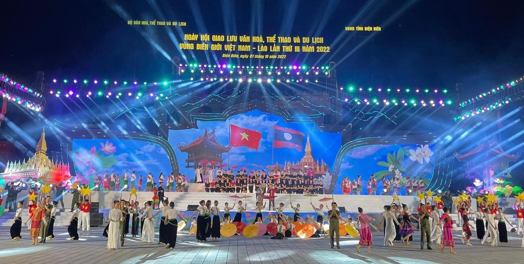 Diễn viên, nghệ nhân Việt Nam-Lào biểu diễn nghệ thuật trong lễ khai mạc Ngày hội Giao lưu văn hóa, thể thao và du lịch vùng biên giới Việt Nam-Lào lần thứ III với chủ đề “Sáng mãi tình hữu nghị Việt-Lào” năm 2022 tại tỉnh Điện Biên.