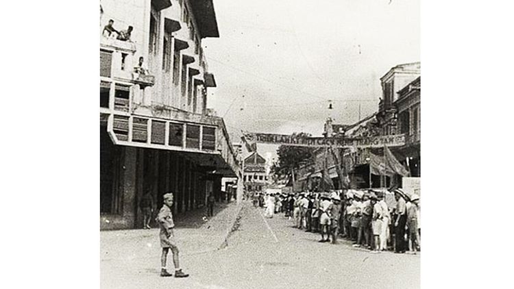 Hoạt động kỷ niệm Cách mạng Tháng Tám diễn ra tại phố Tràng Tiền năm 1946. Ảnh: TƯ LIỆU