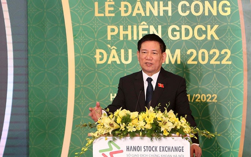 Bộ trưởng Hồ Đức Phớc tại Lễ đánh cồng phiên giao dịch chứng khoán đầu năm 2022.