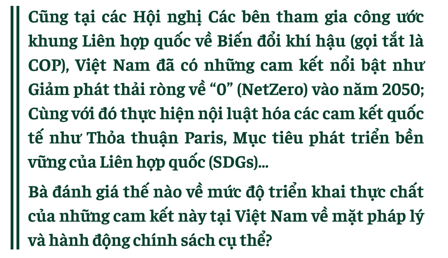 Việt Nam đã đạt được những tiến bộ đáng kể trong việc lồng ghép các cam kết quốc tế về khí hậu vào khuôn khổ pháp lý và chính sách quốc gia. Luật Bảo vệ môi trường sửa đổi năm 2020 đã tạo cơ sở pháp lý tổng thể cho việc giảm nhẹ phát thải khí nhà kính, thích ứng và huy động tài chính cho khí hậu, cùng với các nghị định và hướng dẫn kỹ thuật quan trọng về hệ thống đo lường, báo cáo, thẩm định (MRV), thị trường carbon và kế hoạch giảm nhẹ phát thải theo ngành.