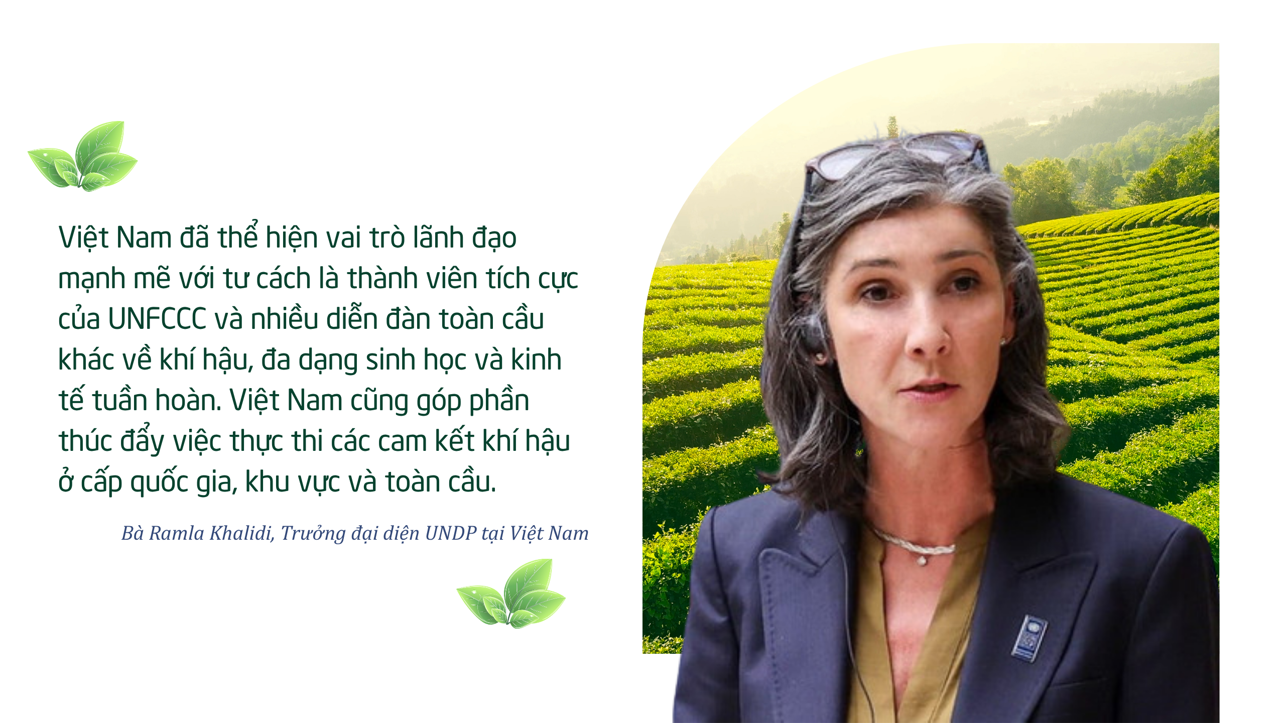 Việt Nam đã thể hiện vai trò lãnh đạo mạnh mẽ với tư cách là thành viên tích cực của UNFCCC và nhiều diễn đàn toàn cầu khác về khí hậu, đa dạng sinh học và kinh tế tuần hoàn. Việt Nam cũng góp phần thúc đẩy việc thực thi các cam kết khí hậu ở cấp quốc gia, khu vực và toàn cầu.