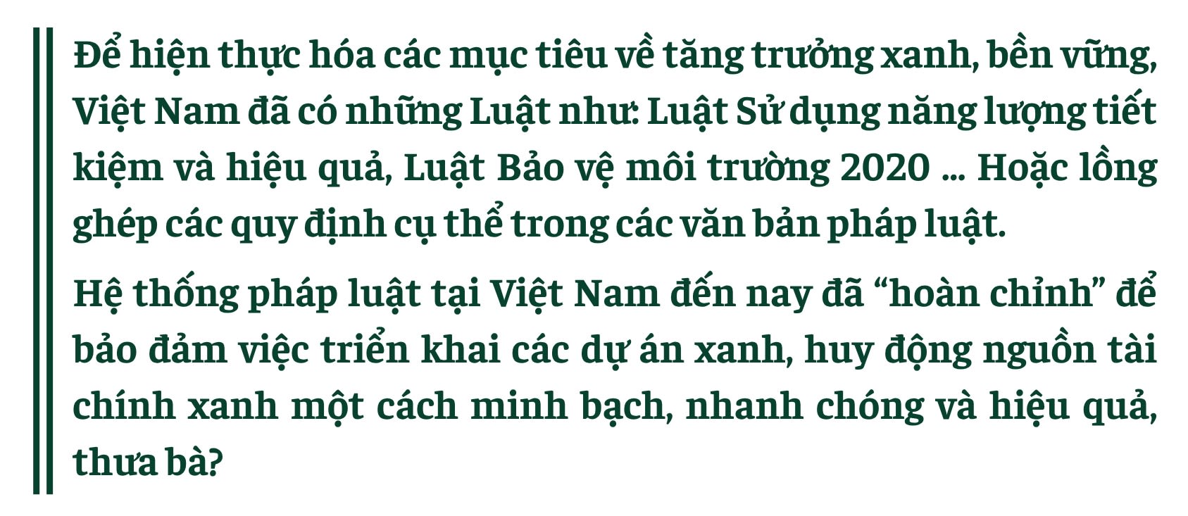 Nhìn tổng thể, Việt Nam đã đạt tiến bộ lớn, song cần tiếp tục hoàn thiện pháp luật, tăng cường phối hợp liên ngành và phát triển các cơ chế khuyến khích hiệu quả hơn để khai mở toàn bộ tiềm năng của tài chính xanh cũng như các dự án.