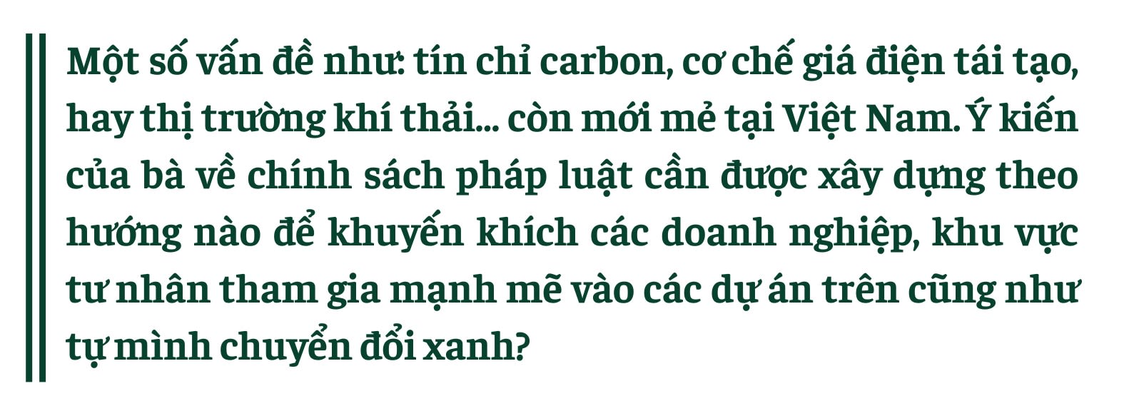 Để khuyến khích sự tham gia mạnh mẽ hơn của khu vực tư nhân, chính phủ nên công bố lộ trình định giá carbon quốc gia với mốc thời gian rõ ràng cho việc triển khai theo từng giai đoạn Hệ thống giao dịch phát thải bắt buộc (ETS) và hướng dẫn các doanh nghiệp trong việc tạo ra và giao dịch tín chỉ trong nước cũng như quốc tế.