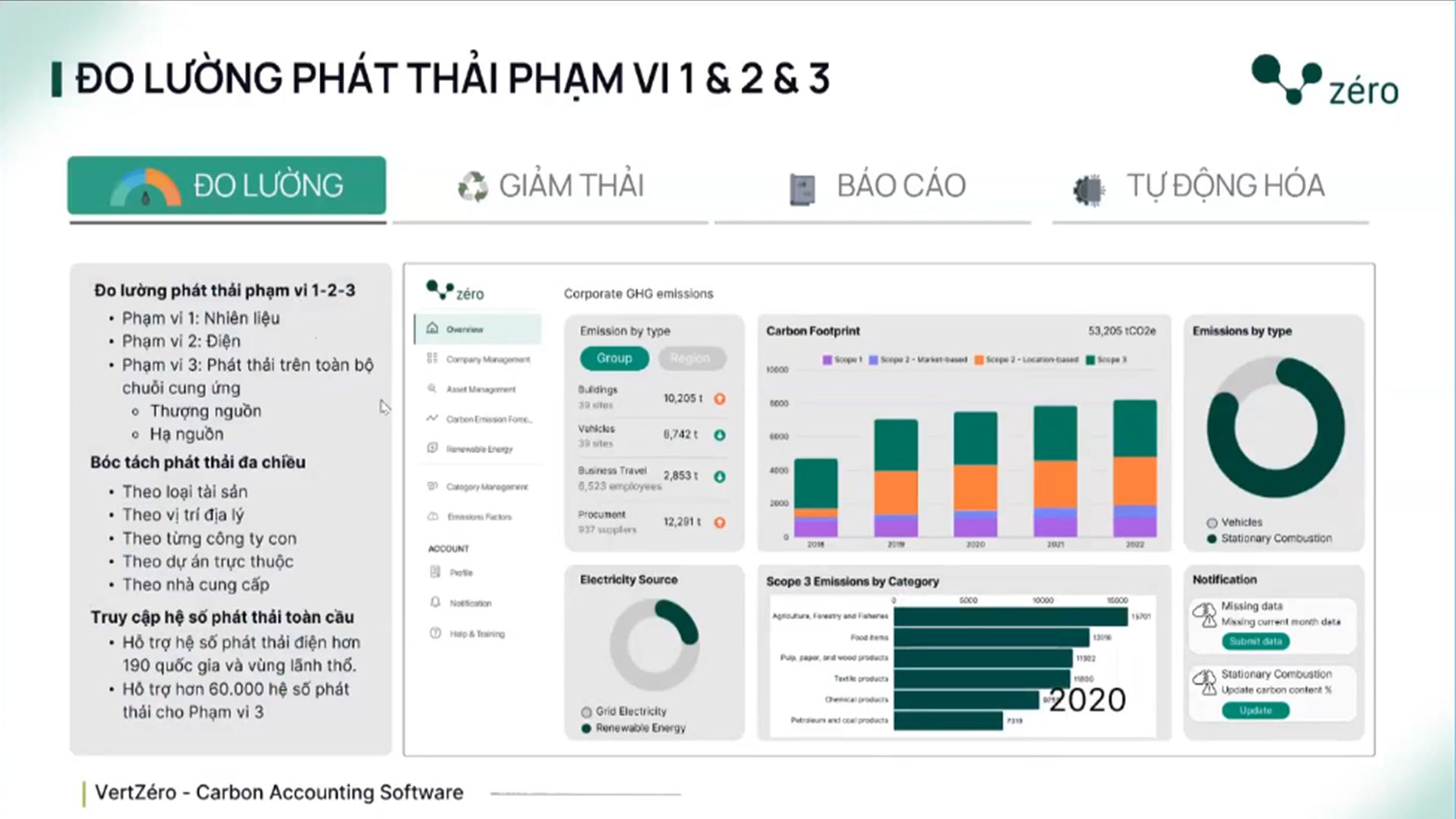Giải pháp tự động hóa kiểm kê khí nhà kính VertZéro giúp doanh nghiệp đo lường mức độ phát thải, lên kế hoạch giảm thải hướng đến Net Zero.