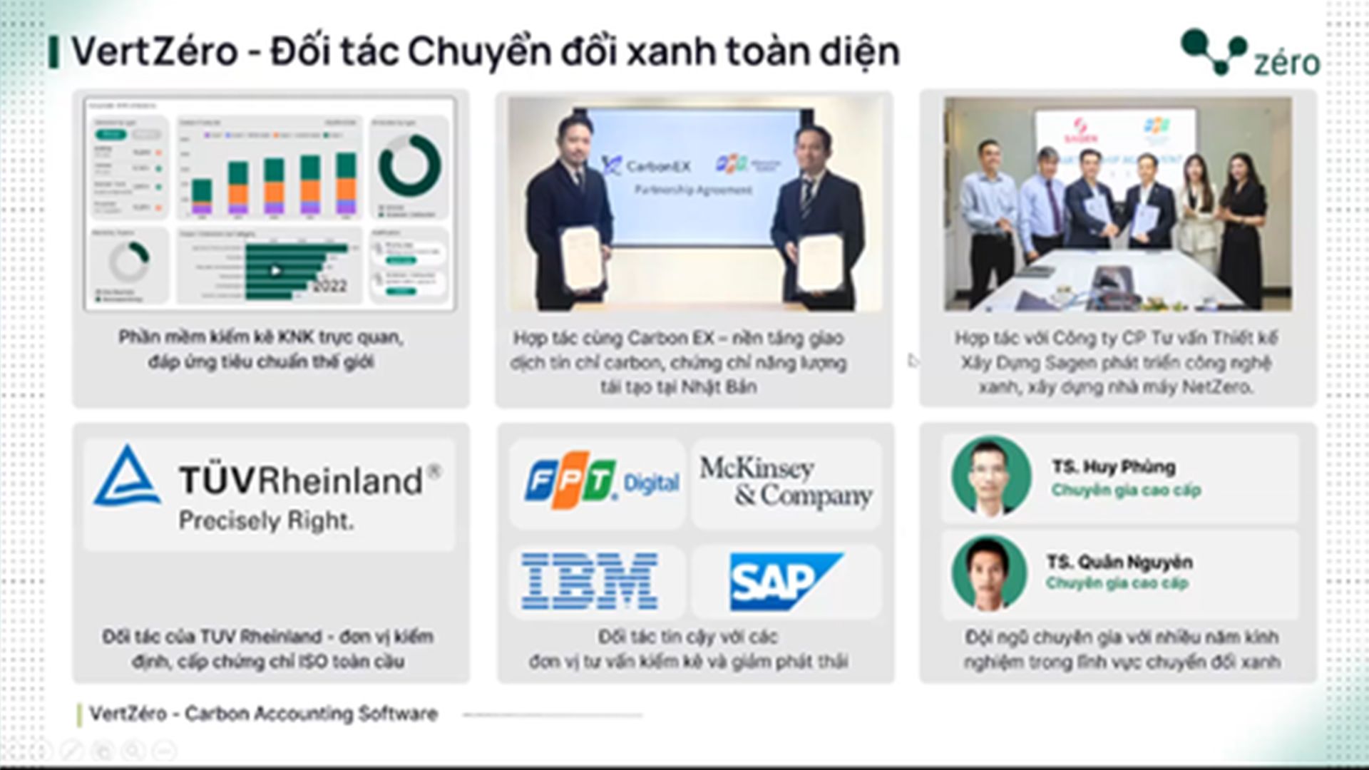 Ông Phạm Tuân cho biết, VertZéro của FPT được phát triển dựa trên các tiêu chuẩn quốc tế như GHG Protocol, ISO 14064-1:2011, và Nghị định 06/2022/NĐ-CP của Chính phủ Việt Nam. Giải pháp này cung cấp hơn 90.000 hệ số phát thải, phục vụ doanh nghiệp tại 190 quốc gia, và hợp tác với hơn 30 đối tác trong hệ sinh thái chuyển đổi xanh toàn cầu. Điều này giúp doanh nghiệp dễ dàng và nhanh chóng tiếp cận thông tin phát thải từ chuỗi cung ứng của mình.