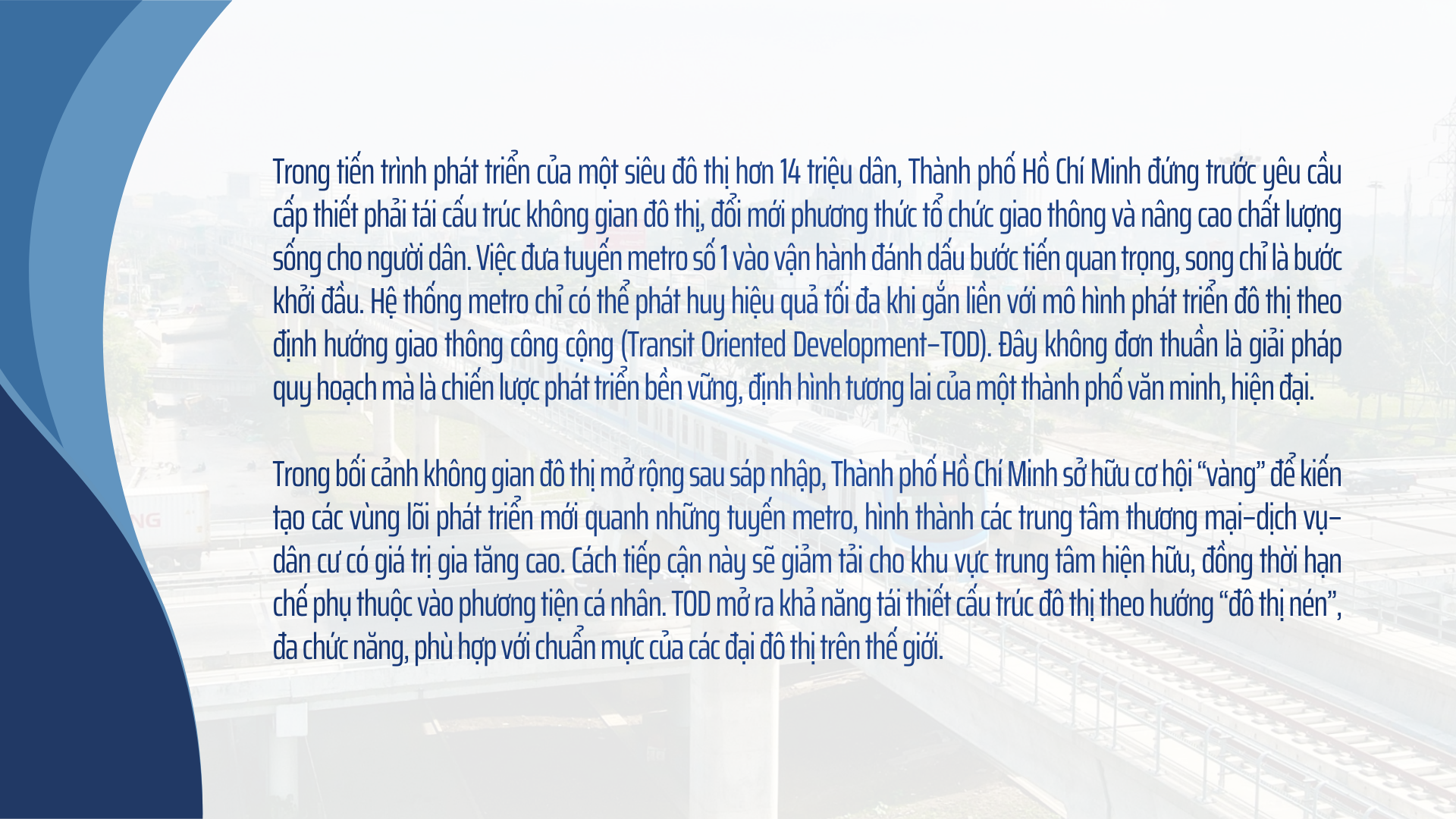 TOD không chỉ là một khái niệm quy hoạch, mà còn là tầm nhìn chiến lược của Thành phố Hồ Chí Minh trong giai đoạn phát triển mới. Khi metro trở thành trục giao thông chủ đạo, TOD sẽ đóng vai trò “bộ khung” tái cấu trúc không gian sống, hình thành các vành đai tăng trưởng, cải thiện môi trường và giảm dần sự phụ thuộc vào phương tiện cá nhân.
