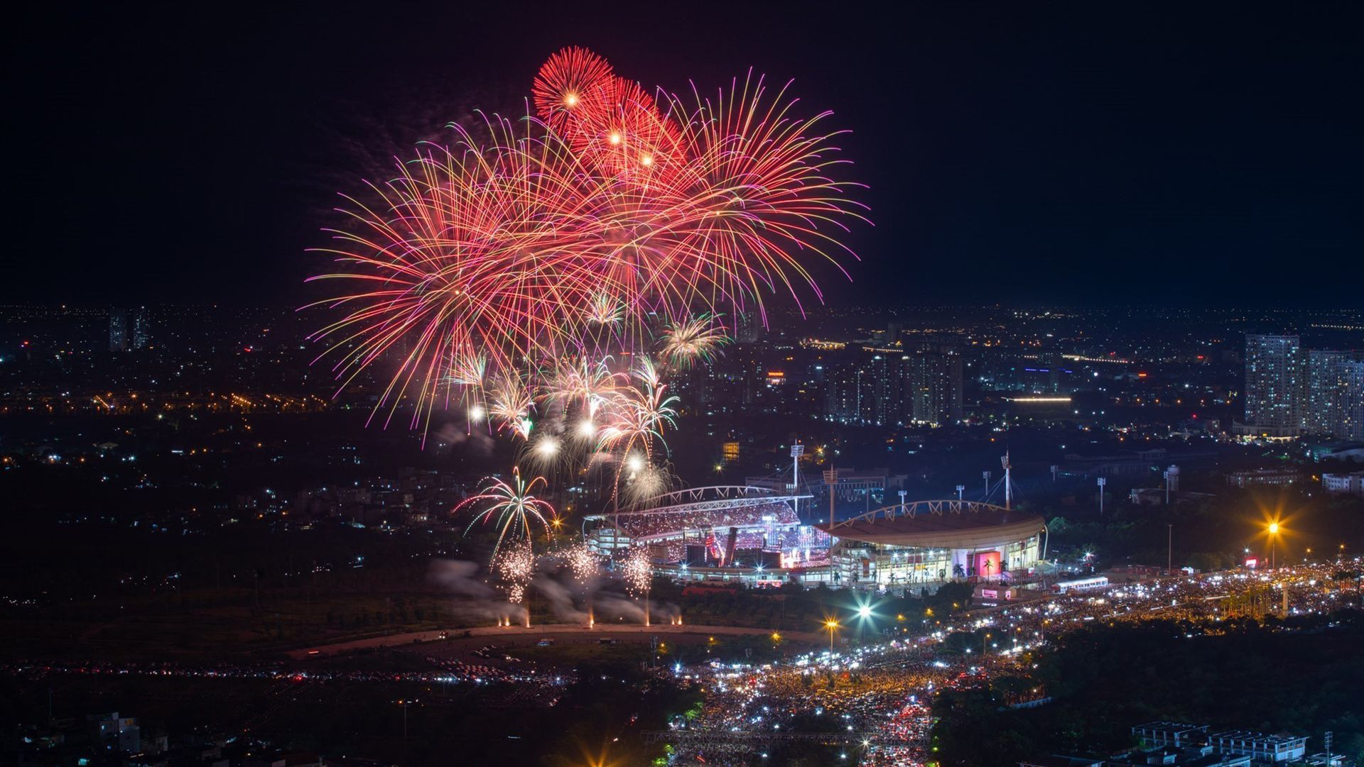 Màn pháo hoa sau một chương trình nghệ thuật chính luận nhân kỷ niệm 80 năm Cách mạng tháng Tám và Quốc khánh 2/9. (Ảnh: TTXVN)