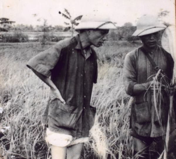 (Ông Kim Ngọc (trái) thăm ruộng lúa bị bệnh vàng lụi. (Ảnh tư liệu: baotanglichsu.vn)