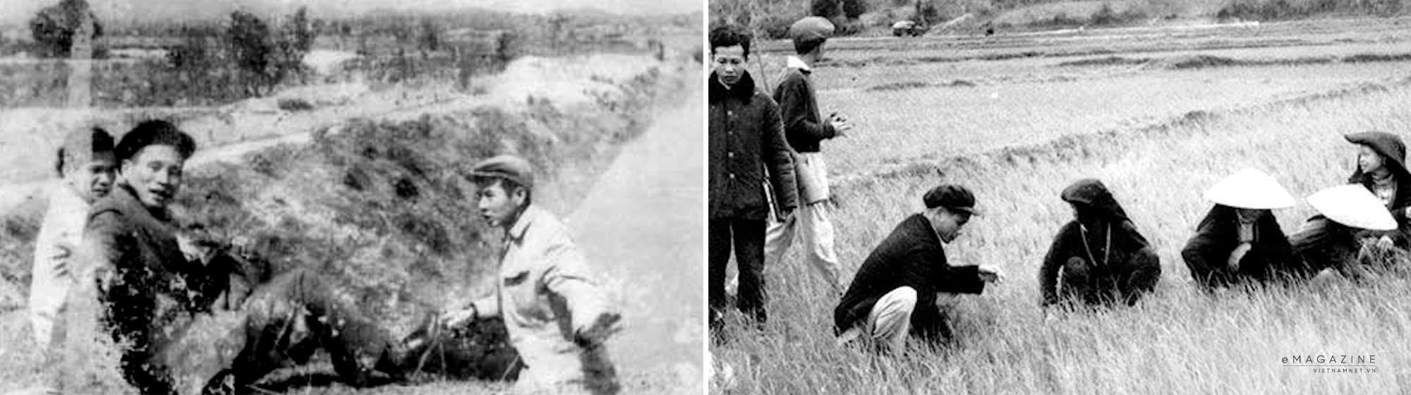 Bí thư Tỉnh ủy Kim Ngọc (thứ nhất từ trái sang phải) thăm đội sản xuất tơ tằm tại xã Văn Quán, huyện Yên Lãng (nay là huyện Mê Linh), ngày 14/12/1968. (Ảnh: Cổng thông tin điện tử tỉnh Vĩnh Phúc)