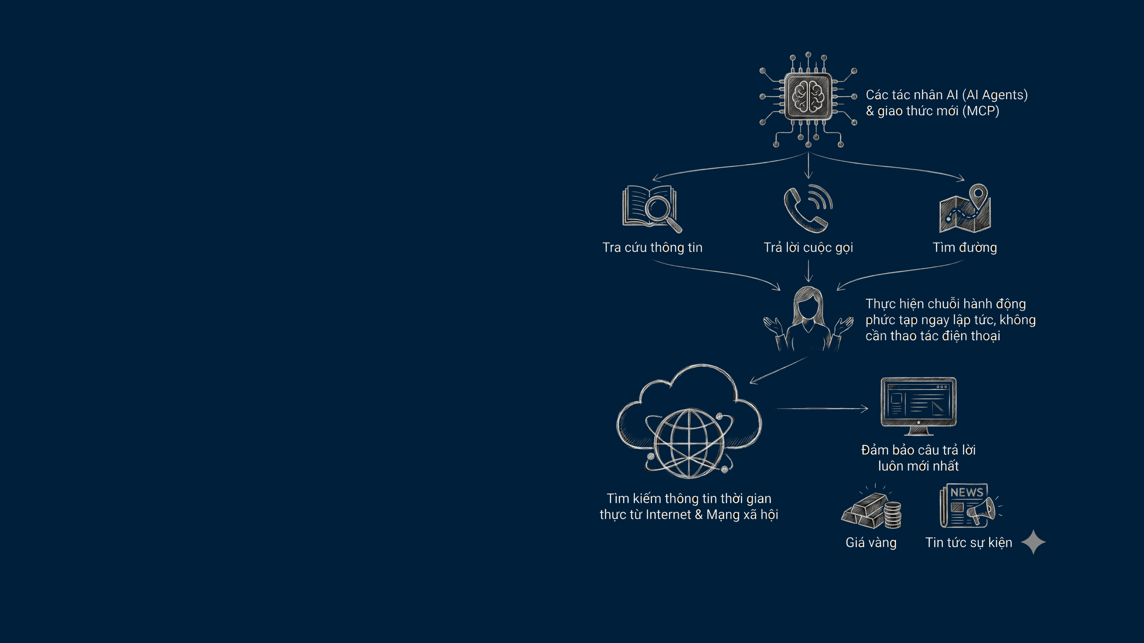 Các tác nhân AI (AI Agents) được trang bị giao thức kết nối mới (như MCP) có thể thực hiện chuỗi hành động phức tạp ngay lập tức, ví dụ: tra cứu thông tin, trả lời cuộc gọi, hoặc tìm đường mà không cần người dùng phải thao tác với điện thoại. Khả năng tìm kiếm thông tin thời gian thực từ Internet và mạng xã hội đảm bảo câu trả lời luôn mới nhất, phù hợp cho các truy vấn như giá vàng hay tin tức sự kiện.