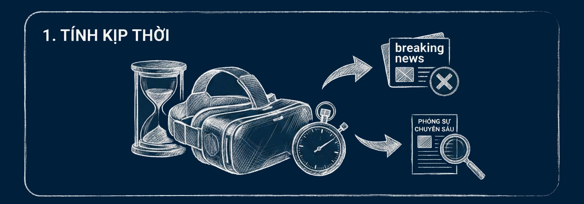· Tính kịp thời: Việc sản xuất nội dung AR/VR chi tiết đòi hỏi nhiều thời gian, khiến báo chí thực tại ảo khó chạy theo tin nhanh, nóng hổi mà phù hợp hơn cho các phóng sự chuyên sâu.