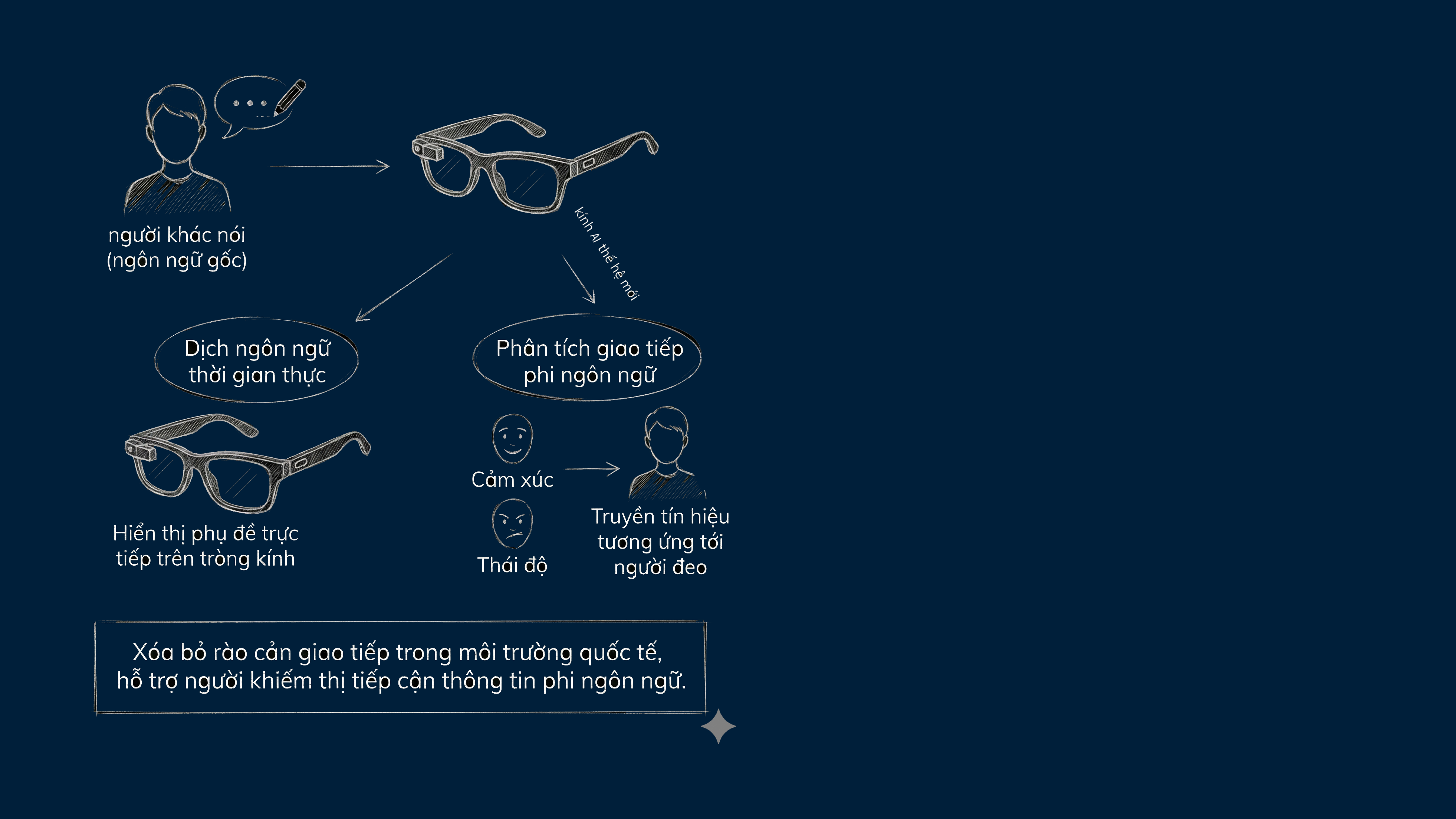 AI cho phép dịch ngôn ngữ thời gian thực ngay khi người khác nói, hiển thị phụ đề trực tiếp lên tròng kính. Điều này xóa bỏ rào cản giao tiếp trong môi trường quốc tế. Các hệ thống AI thế hệ mới còn có thể phân tích giao tiếp phi ngôn ngữ (như cảm xúc, thái độ) và truyền tín hiệu tương ứng tới người đeo, điều mà người khiếm thị gặp khó khăn khi tiếp cận.