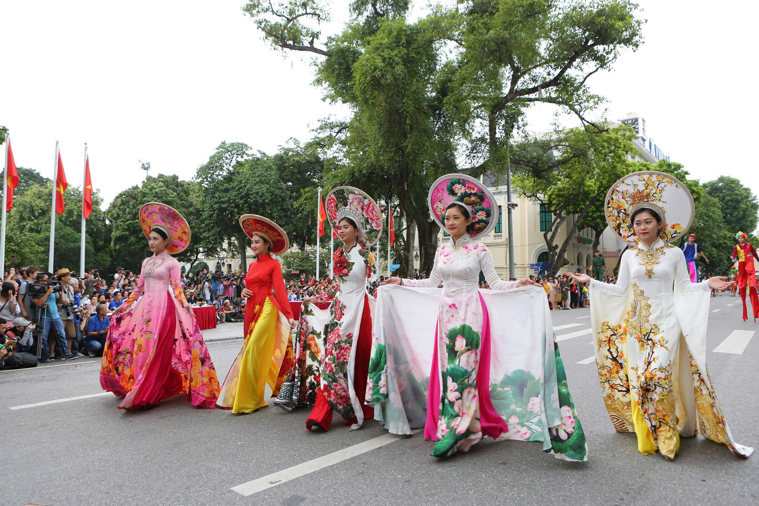 Trình diễn áo dài trên đường phố Hà Nội.