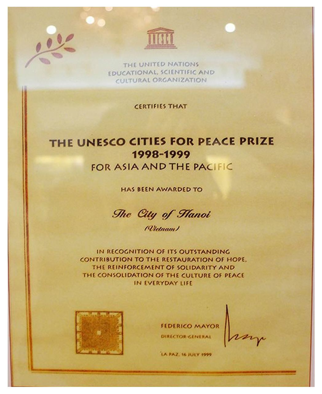 Giấy chứng nhận Thành phố vì hòa bình UNESCO tặng cho Thủ đô Hà Nội. (Ảnh: Báo HàNộimới)
