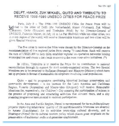 Ông Hòa cho biết: Vào cuối những năm 90 của thế kỷ trước, tình hình thế giới có nhiều biến động, xung đột vũ trang diễn ra gay gắt tại nhiều nơi trên thế giới nên Liên hợp quốc muốn thúc đẩy những giá trị hòa bình và nhấn mạnh, hòa bình đạt được không phải bằng súng đạn, mà bằng văn hóa. Từ đó, UNESCO có sáng kiến trao giải “Thành phố Vì hòa bình”.