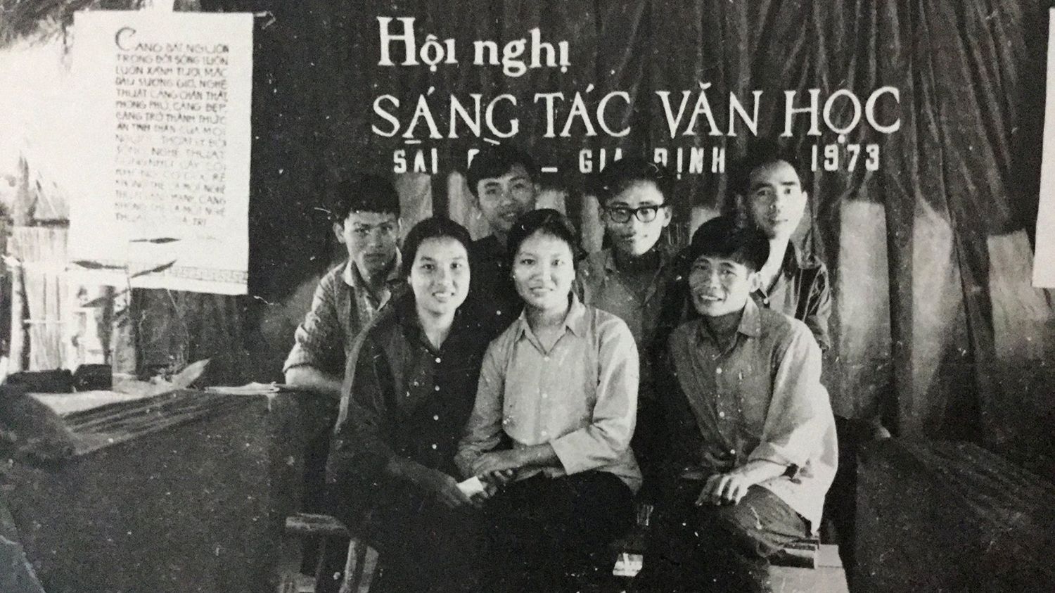 Hội nghị sáng tác văn học Sài Gòn-Gia Định năm 1973. Các đại biểu trong ảnh: Phan An, Nguyễn Khắc Thuần, Phan Xuân Biên, Nguyễn Văn Sơn (hàng trên, từ phải qua); Trần Ấm, Trần Thị Thắng, Hà Phương (hàng dưới, từ phải qua) tại Hội nghị Văn nghệ Sài Gòn-Gia Định năm 1973. (Ảnh: Tư liệu của nhà văn Trần Thị Thắng)