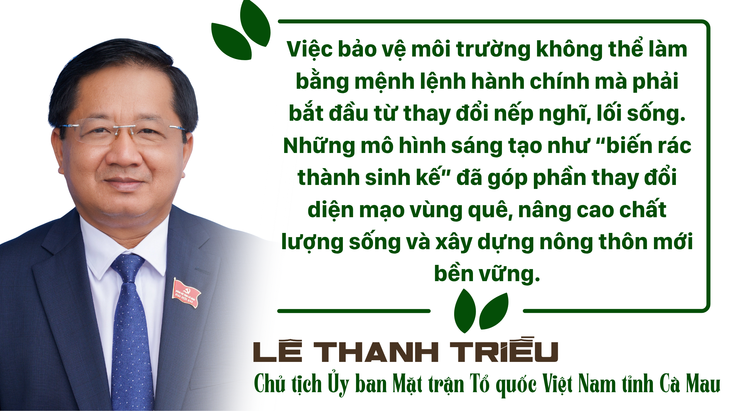 Chủ tịch Ủy ban Mặt trận Tổ quốc Việt Nam tỉnh Cà Mau Lê Thanh Triều nhận định: “Việc bảo vệ môi trường không thể làm bằng mệnh lệnh hành chính mà phải bắt đầu từ thay đổi nếp nghĩ, lối sống. Những mô hình sáng tạo như “biến rác thành sinh kế” đã góp phần thay đổi diện mạo vùng quê, nâng cao chất lượng sống và xây dựng nông thôn mới bền vững”.