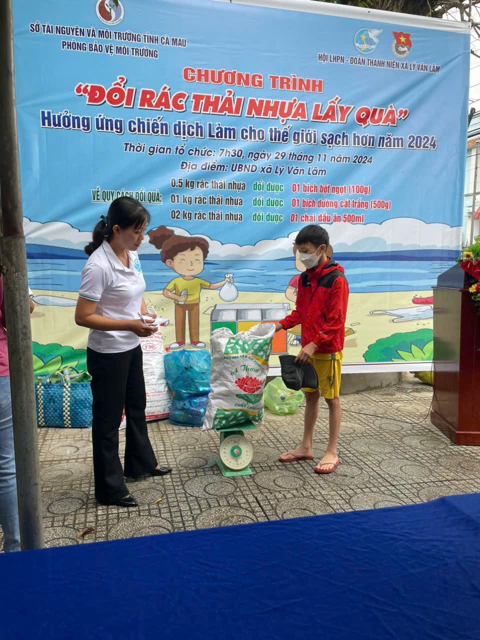 Đại diện Hội Liên hiệp Phụ nữ xã Lý Văn Lâm, huyện Châu Thành, tỉnh Cà Mau hướng dẫn người dân đổi rác thải nhựa lấy quà. (Ảnh: Báo Cà Mau)