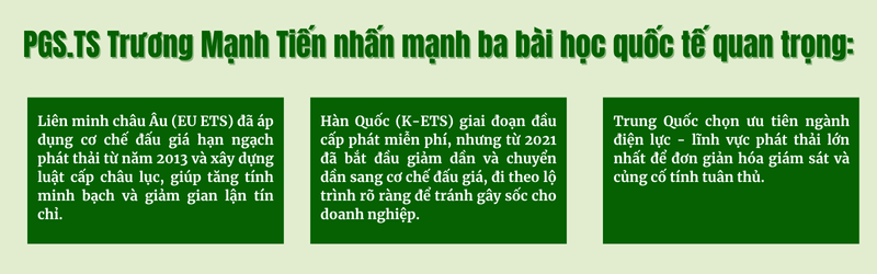 • Hàn Quốc (K-ETS) giai đoạn đầu cấp phát miễn phí, nhưng từ 2021 đã bắt đầu giảm dần và chuyển dần sang cơ chế đấu giá, đi theo lộ trình rõ ràng để tránh gây sốc cho doanh nghiệp.