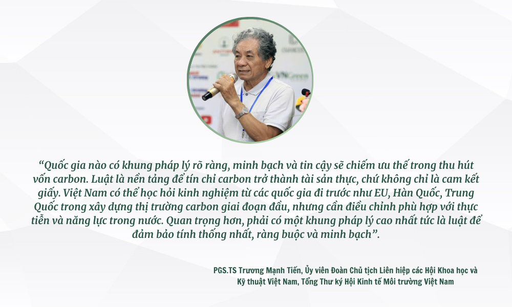 Cuối cùng, PGS.TS Trương Mạnh Tiến, Ủy viên Đoàn Chủ tịch Liên hiệp các Hội Khoa học và Kỹ thuật Việt Nam, Tổng Thư ký Hội Kinh tế Môi trường Việt Nam, khẳng định: “Quốc gia nào có khung pháp lý rõ ràng, minh bạch và tin cậy sẽ chiếm ưu thế trong thu hút vốn carbon. Luật là nền tảng để tín chỉ carbon trở thành tài sản thực, chứ không chỉ là cam kết giấy. Việt Nam có thể học hỏi kinh nghiệm từ các quốc gia đi trước như EU, Hàn Quốc, Trung Quốc trong xây dựng thị trường carbon giai đoạn đầu, nhưng cần điều chỉnh phù hợp với thực tiễn và năng lực trong nước. Quan trọng hơn, phải có một khung pháp lý cao nhất tức là luật để đảm bảo tính thống nhất, ràng buộc và minh bạch”.