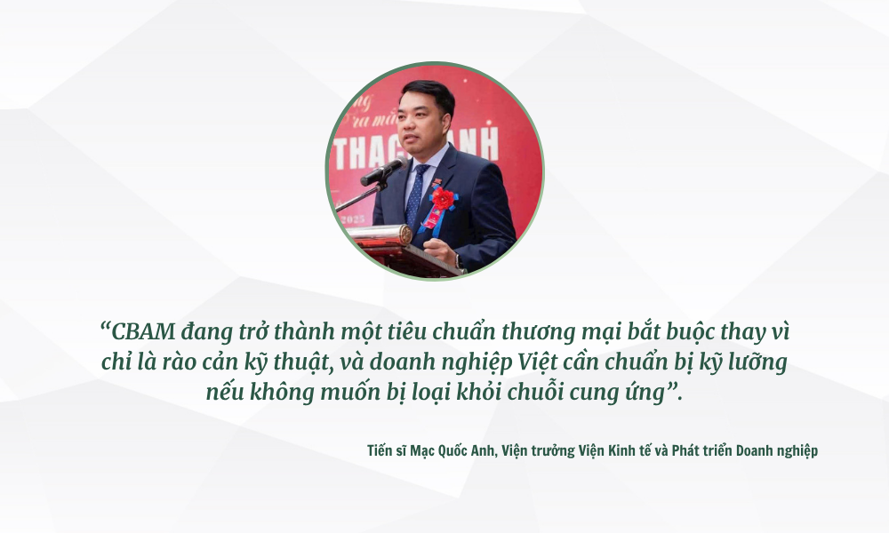 Ngoài ra, Tiến sĩ Mạc Quốc Anh, Viện trưởng Viện Kinh tế và Phát triển Doanh nghiệp, chia sẻ tại tọa đàm “Từ CBAM đến Thị trường Carbon - Lộ trình tuân thủ mới cho doanh nghiệp Việt” thuộc chuỗi “Talk GreenBiz - La bàn tăng trưởng xanh” cho rằng, CBAM đang trở thành một tiêu chuẩn thương mại bắt buộc thay vì chỉ là rào cản kỹ thuật, và doanh nghiệp Việt cần chuẩn bị kỹ lưỡng nếu không muốn bị loại khỏi chuỗi cung ứng. Hiện nay, Liên minh châu Âu đã chính thức triển khai Cơ chế điều chỉnh biên giới carbon (CBAM) với giai đoạn “tính thử” từ 2023-2025. Trong giai đoạn này, doanh nghiệp xuất khẩu sang EU phải nộp báo cáo phát thải kèm theo đơn hàng nhưng chưa phải nộp thuế. Từ năm 2026, nếu không nộp đủ tín chỉ carbon tương ứng với lượng phát thải, doanh nghiệp sẽ bị áp thuế carbon từ 70-90 EUR/tấn CO₂.