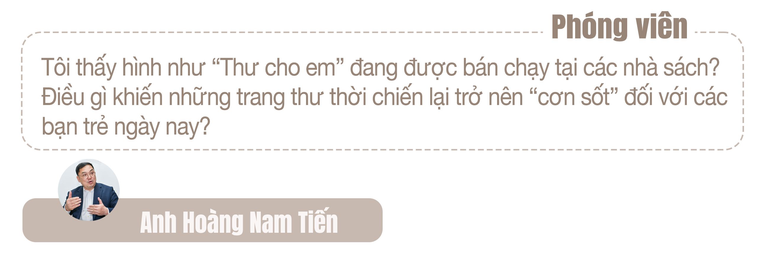 Tôi khá bất ngờ khi cuốn “Thư cho em” hiện nay đang được nhiều người tìm đọc, liên tục in thêm đều bán hết. Có lẽ vì bạn đọc ngày nay thấy thú vị về một chuyện tình thời chiến “khi Tổ quốc cần họ biết sống xa nhau”; cũng có thể vì những trang thư hết sức lãng mạn và trong đó, hình ảnh một vị tướng chiến trận hiện lên như một “soái ca”.