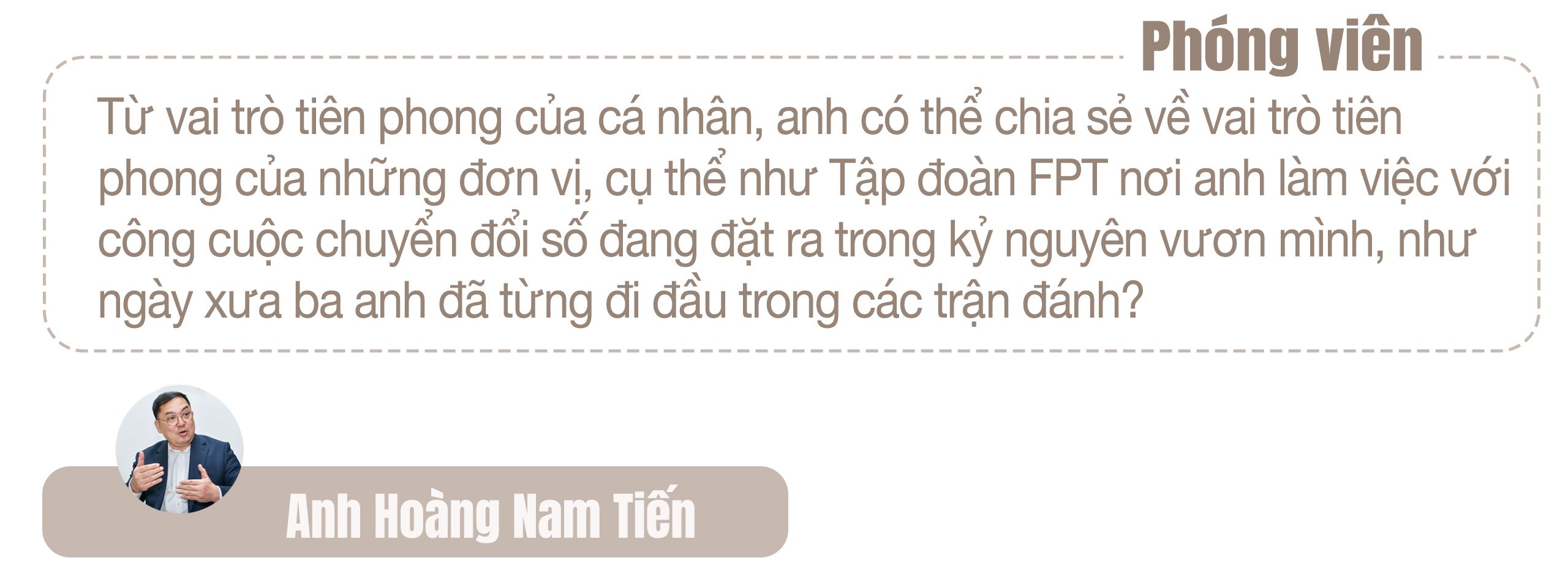 Ba tôi cũng từng viết trong cuốn sách “Những điều đọng lại sau hai cuộc chiến tranh” về những phẩm chất người lãnh đạo cần có: phải có tài năng lãnh đạo, phải hiểu về triết học, lịch sử, phải đọc nhiều sách, và hơn hết, là trải nghiệm thực tế. Và ba tôi nhấn mạnh: Thao trường đổ mồ hôi thì chiến trường bớt đổ máu. Khi tôi làm lãnh đạo ở Telecom hay Software cũng vậy, mọi việc từ sản xuất, bán hàng, nắm vững yêu cầu khách hàng, hiểu được tâm lý anh em, đều phải lăn xả vào cùng làm. Lãnh đạo không làm thay nhưng phải làm gương. Và như bạn nói đấy, mặt trận nào thì cũng cần có những người xung kích.