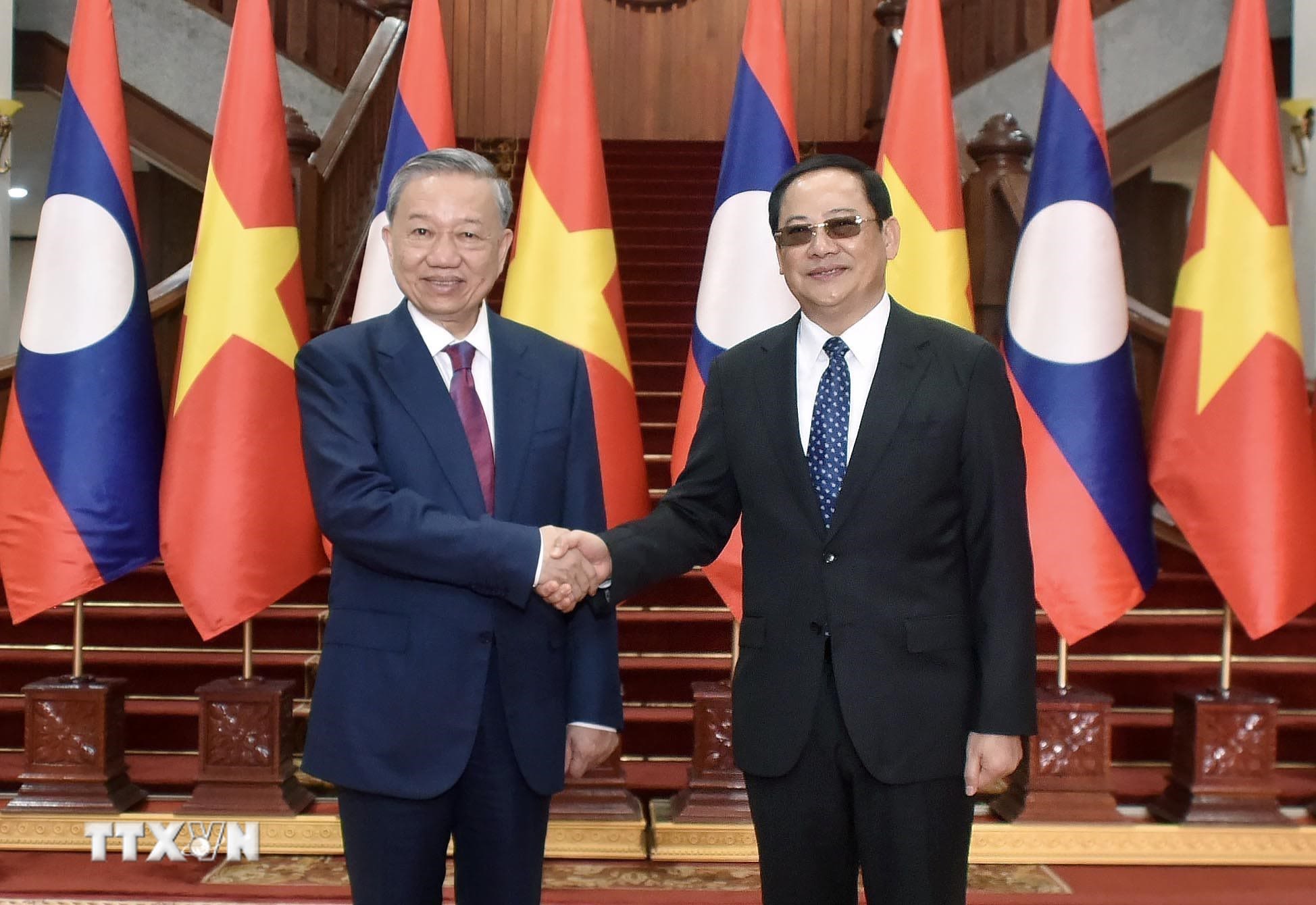 Chủ tịch nước Tô Lâm hội kiến Thủ tướng Lào Sonexay Siphandone. Ảnh: TTXVN