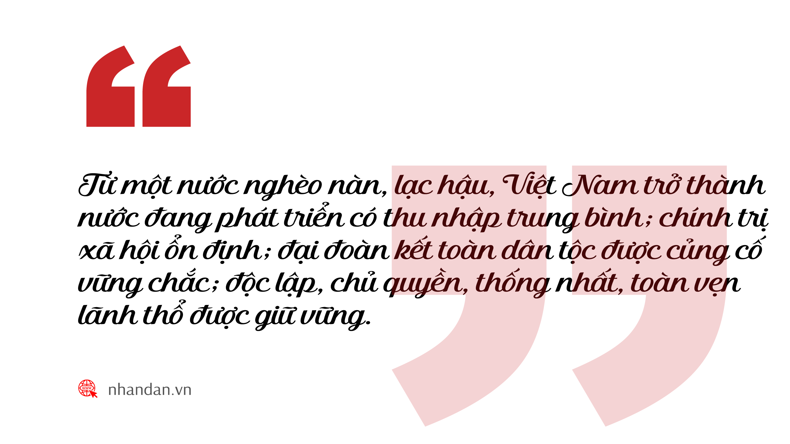 Trong thời kỳ đổi mới, Đảng đã kiên định độc lập dân tộc trên cơ sở giữ vững độc lập, chủ quyền, thống nhất toàn vẹn lãnh thổ và bảo đảm sự độc lập về chính trị, kinh tế, văn hóa, xã hội. Đồng thời, không ngừng bổ sung, phát triển lý luận về chủ nghĩa xã hội (CNXH) và con đường đi lên CNXH ở Việt Nam trên cơ sở xác định rõ: nội hàm, mục tiêu, phương hướng của thời kỳ quá độ; những đặc trưng và trụ cột của chủ nghĩa xã hội ở Việt Nam. Nhờ đó, sau gần 40 năm đổi mới, từ một nước nghèo, kém phát triển, Việt Nam trở thành một nước có thu nhập trung bình. Hết năm 2024, quy mô nền kinh tế xếp thứ 34 trên thế giới, bình quân đầu người đạt 4.700 USD; lần đầu tiên thu ngân sách đạt trên 2 triệu tỷ đồng, xuất khẩu trên 400 tỷ USD[7].