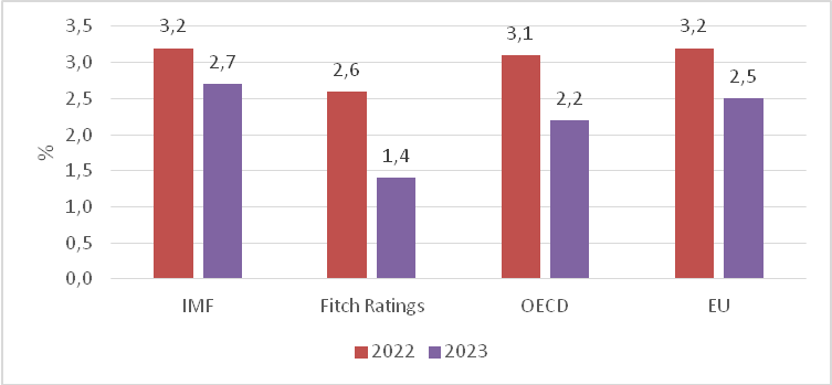 Tháng 10/2022, IMF đã hạ dự báo tăng trưởng kinh tế toàn cầu năm 2023 trong bối cảnh các nước đang chịu tác động từ cuộc xung đột ở Ukraine, giá năng lượng và thực phẩm tăng, lạm phát leo thang và lãi suất tăng mạnh. Theo IMF, tăng trưởng GDP toàn cầu năm 2022 vẫn ở mức 3,2% (thấp hơn nhiều so với mức 6% của năm 2021) và sẽ giảm xuống 2,7% vào năm 2023 (thấp hơn mức dự báo 2,9% IMF đưa ra vào tháng 7/2022).