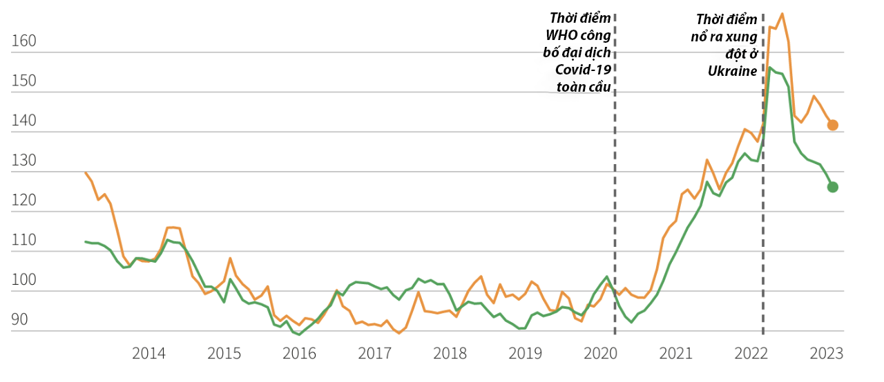 Giá lương thực thế giới đã tăng mạnh trong đại dịch Covid-19 và sau khi nổ ra xung đột Nga-Ukraine. Đường màu xanh hiển thị chỉ số giá lương thực của FAO, đường màu cam hiển thị chỉ số giá ngũ cốc. (Nguồn: Reuters)