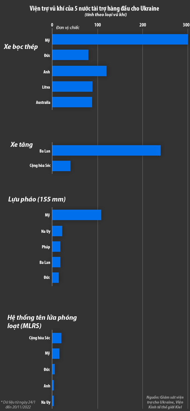 Viện trợ quân sự của phương Tây cho Ukraine bao gồm từ đạn dược đến hệ thống phòng không tiên tiến và cả hệ thống phóng tên lửa HIMARS. Ukraine cũng đã vận động hành lang thành công để các nước trên cung cấp xe tăng tiên tiến cho quốc gia Đông Âu.