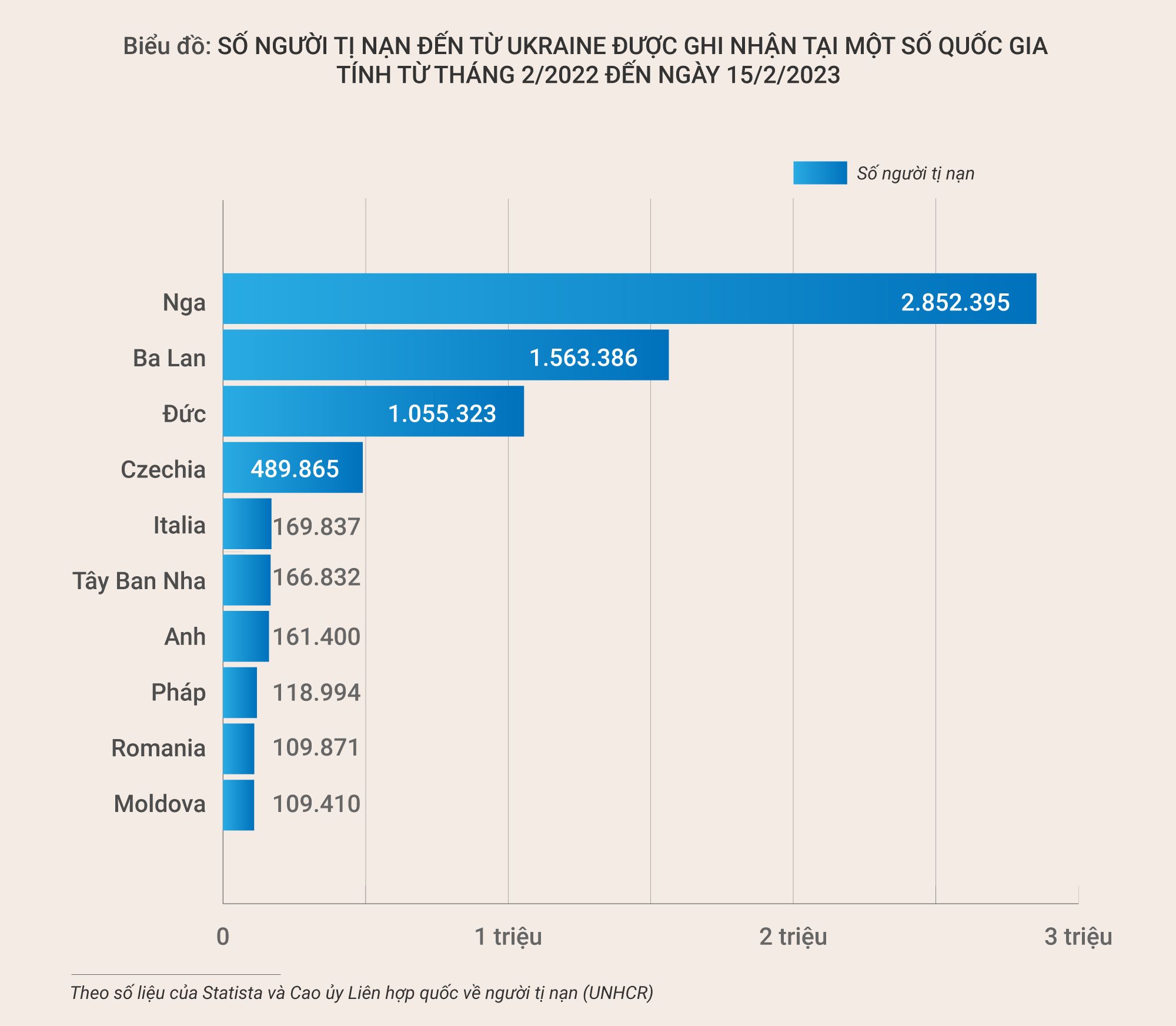 Tính đến ngày 3/10/2022, gần 2,9 triệu người tị nạn đến từ Ukraine được ghi nhận tại Nga. Ước tính, gần 1,6 triệu người khác đã sang Ba Lan lánh nạn tính đến ngày 14/2/2023. Từ khi xung đột bùng phát tại Ukraine, tổng cộng hơn 8 triệu người tị nạn đến từ nước này đã được ghi nhận tại các quốc gia châu Âu. Phần lớn người tị nạn đã di tản thông qua biên giới giữa Ukraine và Ba Lan.