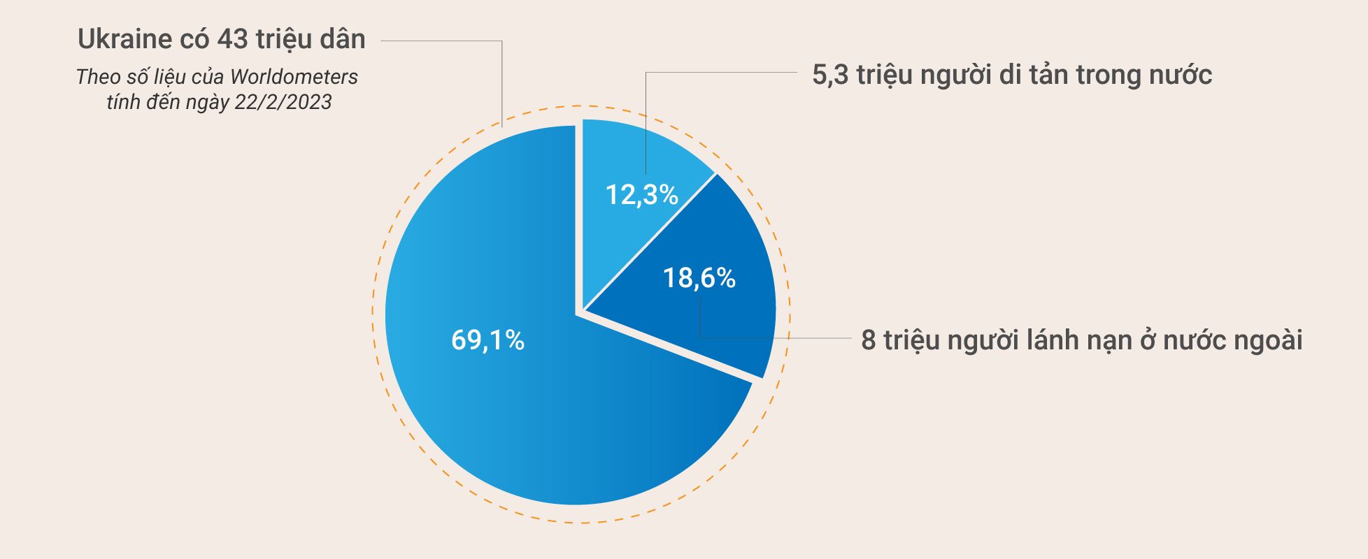 Theo Tổ chức Di cư quốc tế (IOM), gần 1 năm sau khi bùng phát xung đột tại Ukraine, một số cộng đồng tại quốc gia Đông Âu này đang đứng trước nguy cơ lối sống và nơi họ từng sinh sống bị phá hủy hoàn toàn. Khoảng 5,3 triệu người đang phải sơ tán trong nước, và hơn 8 triệu người khác đang lánh nạn ở các quốc gia lân cận.