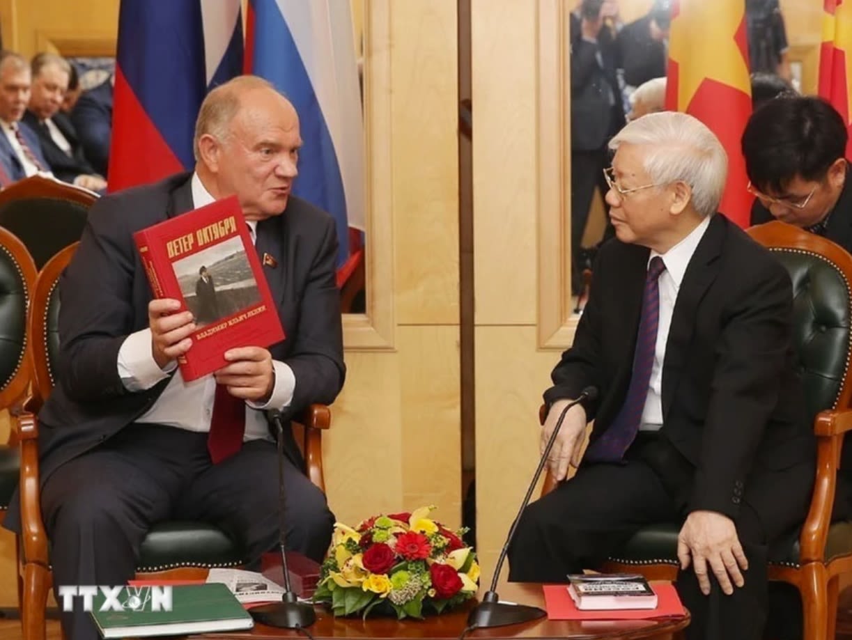 Tổng Bí thư Nguyễn Phú Trọng tiếp Chủ tịch Đảng Cộng sản Liên bang Nga Gennady Ziuganov, sáng 8/9/2018 (theo giờ địa phương), tại thủ đô Moskva. (Ảnh: Trí Dũng/TTXVN)
