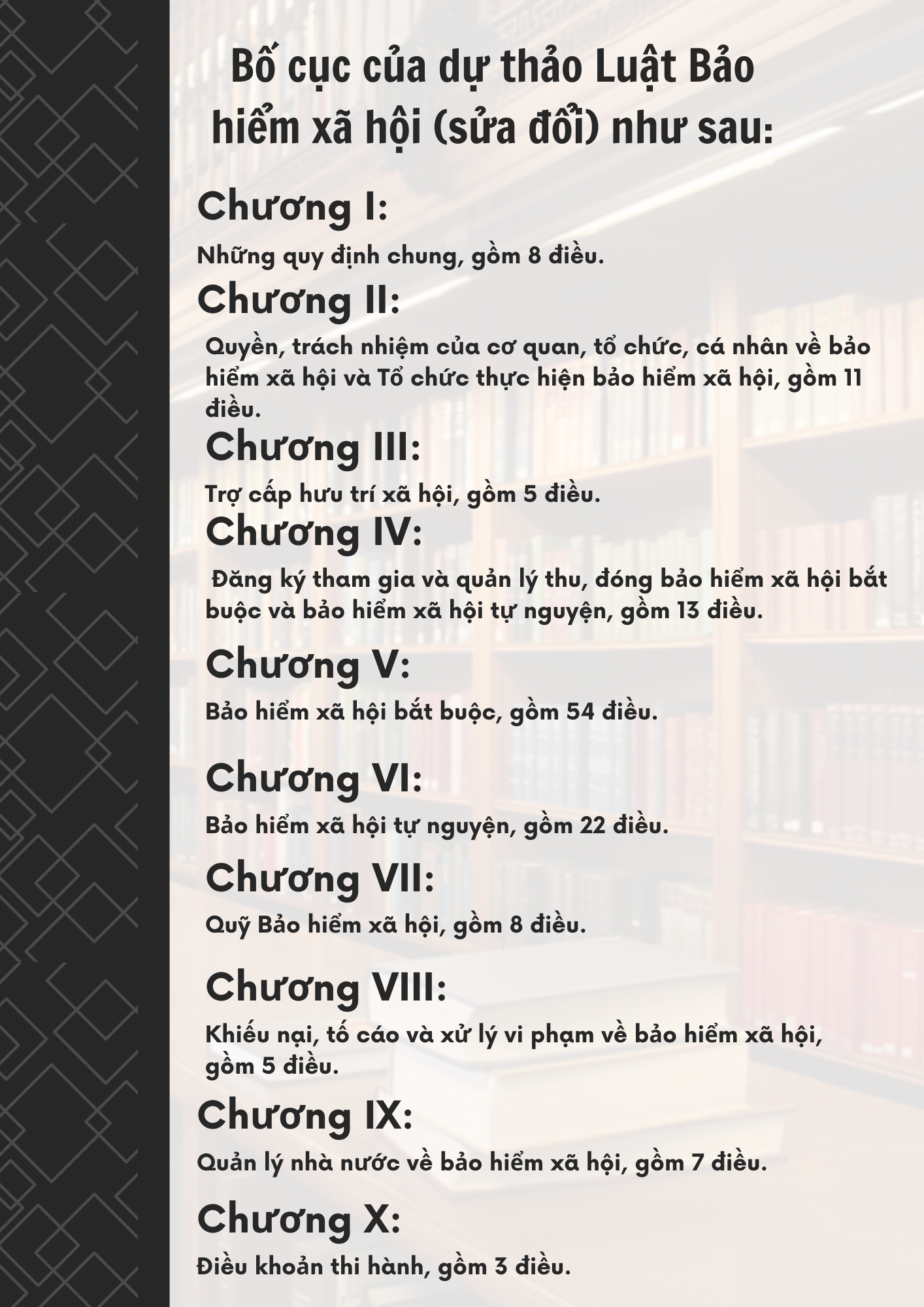 Dự án Luật được kết cấu gồm 10 chương và 136 điều, tăng 1 chương và 11 điều so với Luật Bảo hiểm xã hội năm 2014.