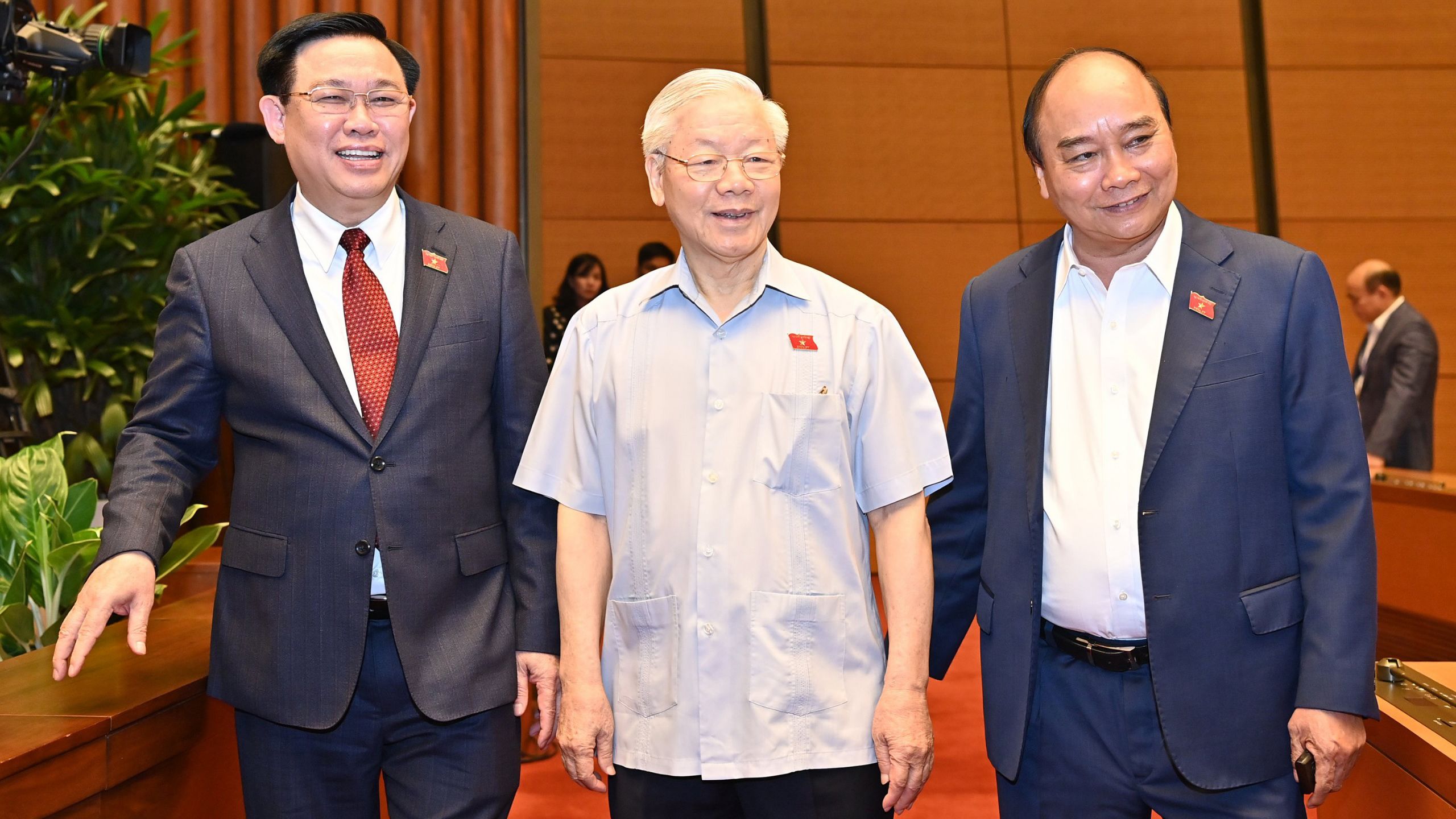 Tổng Bí thư Nguyễn Phú Trọng, Chủ tịch nước Nguyễn Xuân Phúc và Chủ tịch Quốc hội Vương Đình Huệ tại Hội trường Diên Hồng trước phiên làm việc của Quốc hội chiều 7/6.