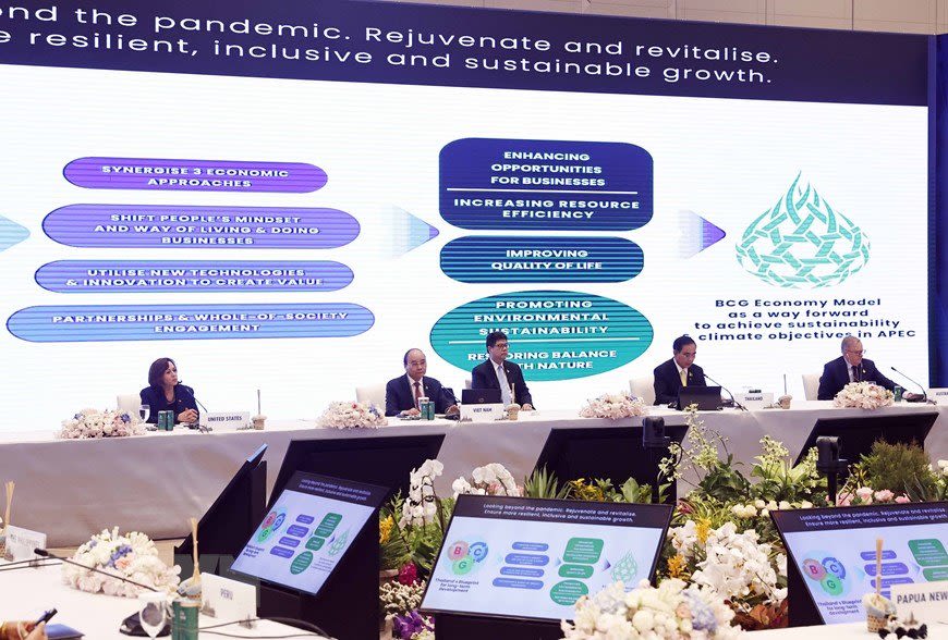 Để định hướng cho việc triển khai chương trình nghị sự về phát triển bền vững và bao trùm, các nhà lãnh đạo APEC đã thông qua Các Mục tiêu Bangkok về mô hình kinh tế sinh học-tuần hoàn-xanh tại phiên thảo luận “Thương mại và đầu tư bền vững”.