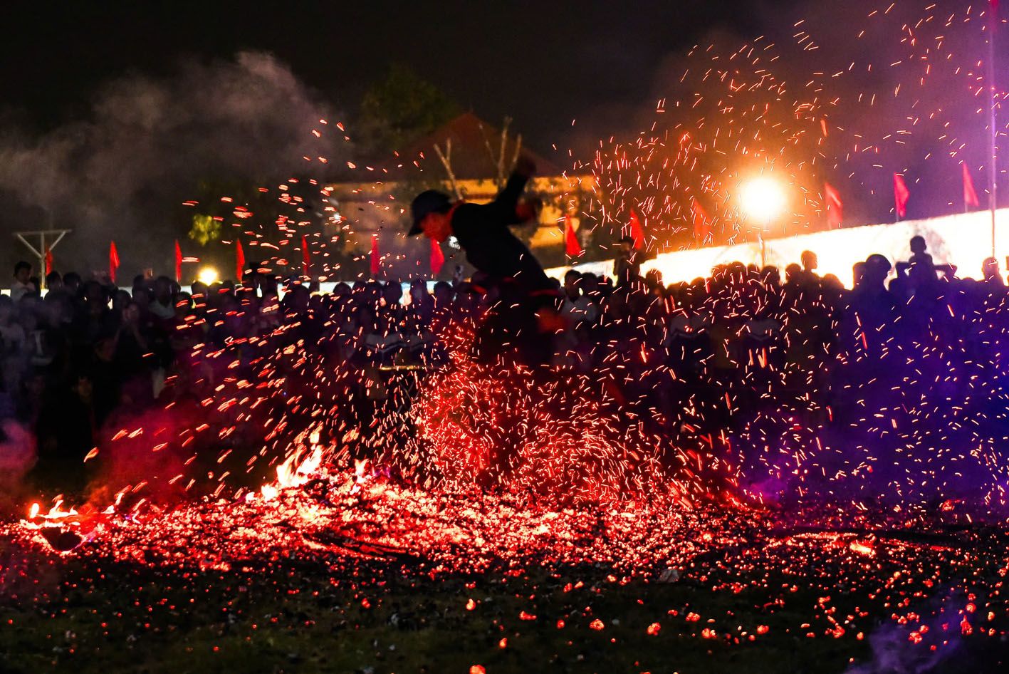 Cùng thời điểm đó, một đống lửa to được đốt giữa mảnh đất rộng tạo nên than hồng. Khi đống lửa đã cháy thành than rực hồng cùng với sự điều khiển của thầy cúng, các thành viên tham gia nhảy lửa lần lượt ngồi trước mặt thầy cúng, nhận sức mạnh và sự che chở của thần linh và tự nhảy vào than hồng nóng rực, đạp lửa bắn tung tóe mà không hề bị bỏng trong tiếng hò reo cổ vũ của mọi người.