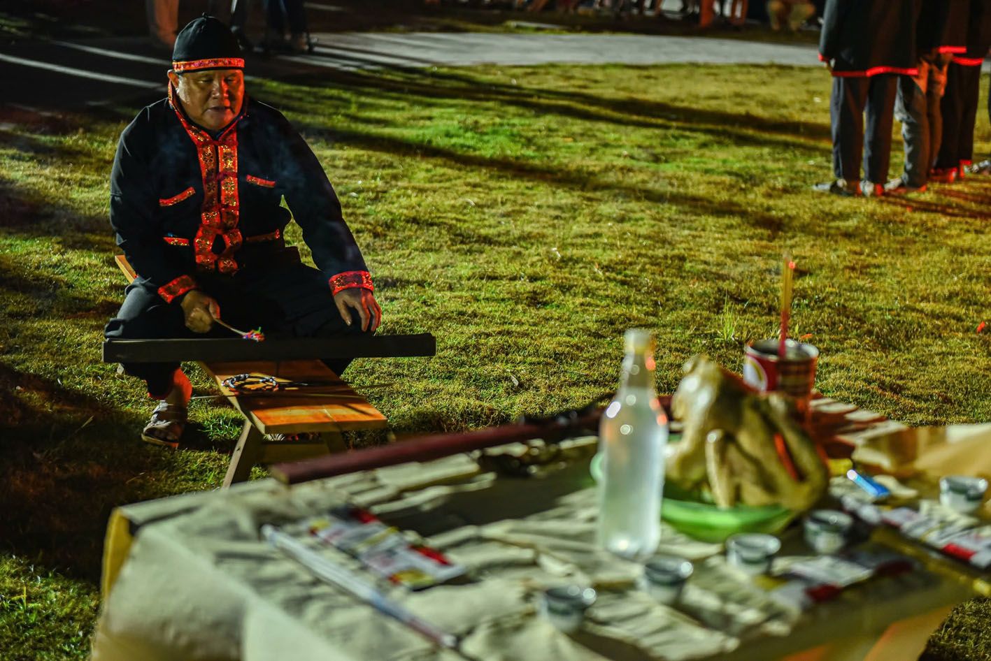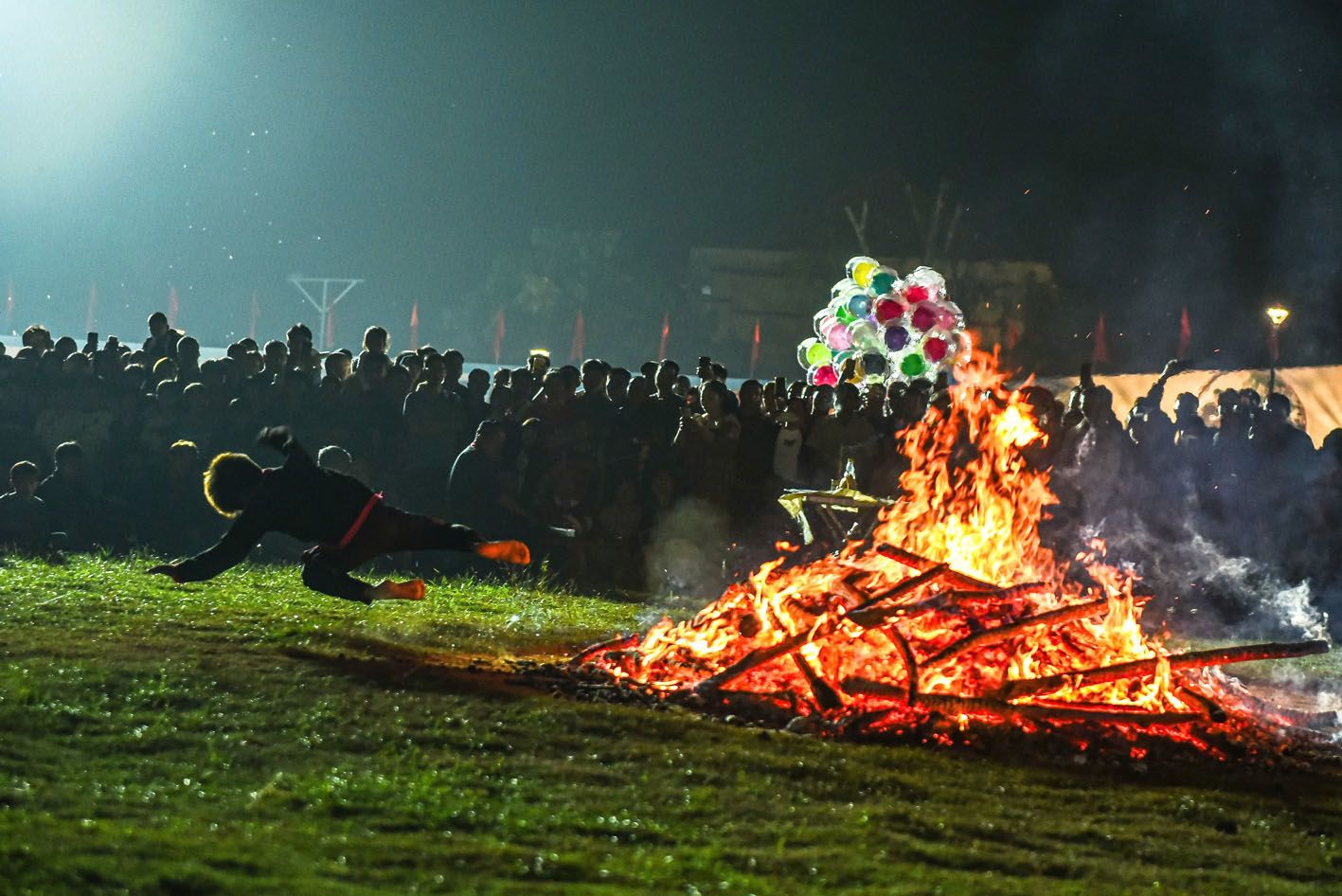 Đống lửa rực hồng, lần lượt từng thanh niên người Pà Thẻn ngồi trước thầy cúng để nhận sự che chở của thần linh, khi được thần linh chọn, người họ bật lên rồi lao ngay vào lửa.