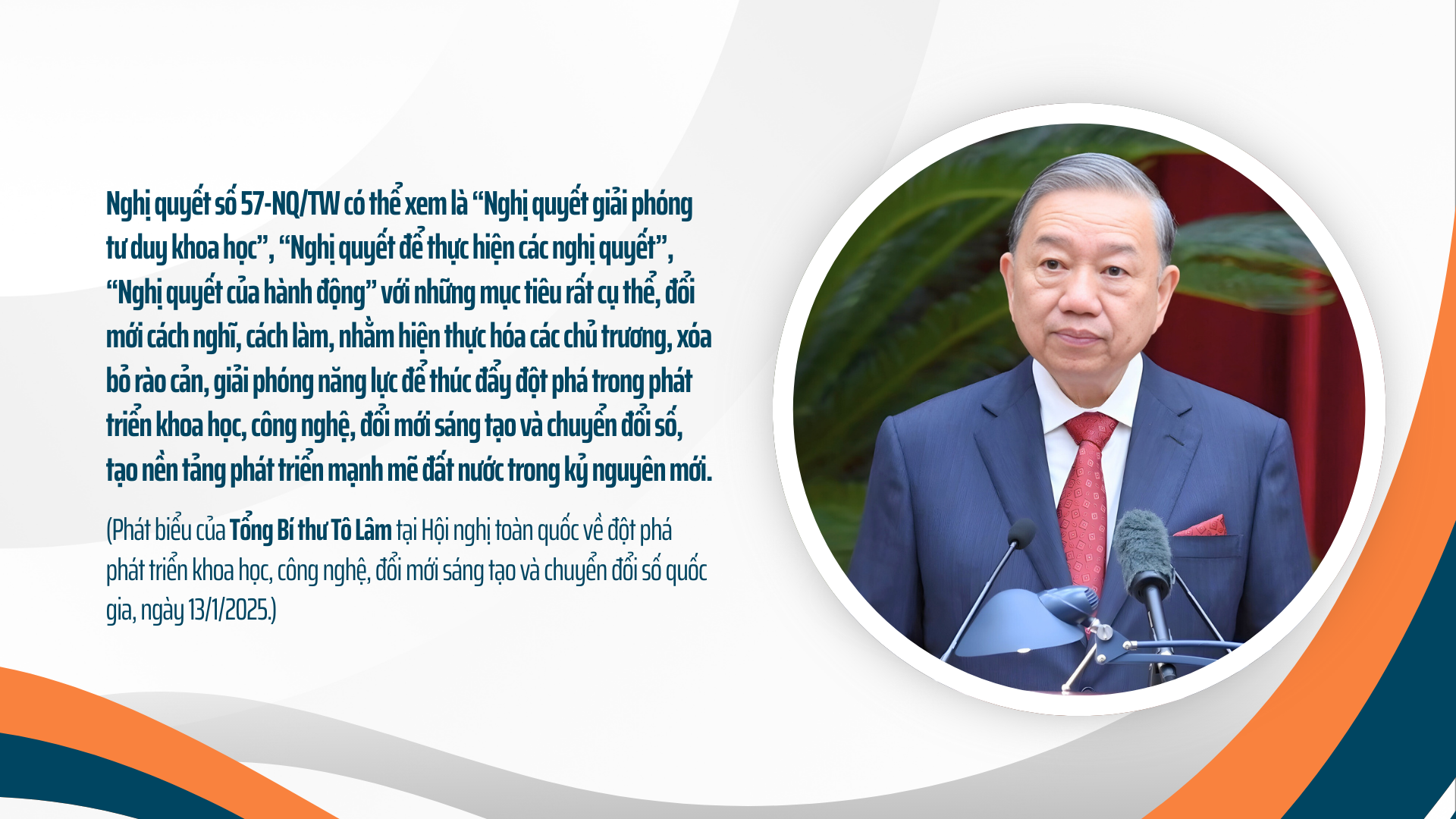 Nghị quyết số 57-NQ/TW thể hiện chủ trương, quyết sách mạnh mẽ, mang tính chiến lược và cách mạng để tạo xung lực mới. Nghị quyết khẳng định đột phá phát triển khoa học, công nghệ, đổi mới sáng tạo và chuyển đổi số là điều kiện tiên quyết để đưa đất nước phát triển mạnh mẽ trong kỷ nguyên mới-kỷ nguyên giàu mạnh, hùng cường; góp phần thực hiện thắng lợi mục tiêu đến năm 2030, Việt Nam trở thành nước đang phát triển, có công nghiệp hiện đại, thu nhập trung bình cao, đến năm 2045, trở thành nước phát triển, thu nhập cao theo định hướng xã hội chủ nghĩa.