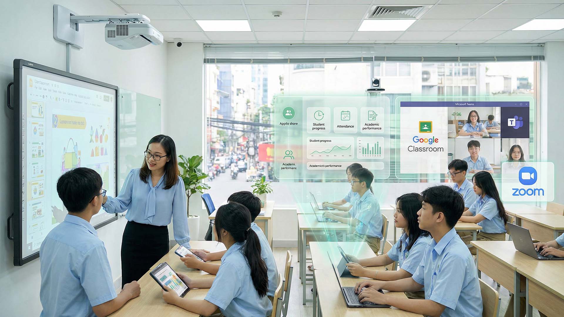 - Xây dựng các nền tảng giáo dục thông minh, sách giáo khoa, giáo trình thông minh; ứng dụng khoa học công nghệ, trí tuệ nhân tạo trong đổi mới phương pháp dạy và học, kiểm tra, đánh giá; thúc đẩy các mô hình giáo dục số, giáo dục trí tuệ nhân tạo, quản trị giáo dục thông minh, trường học số, lớp học thông minh.