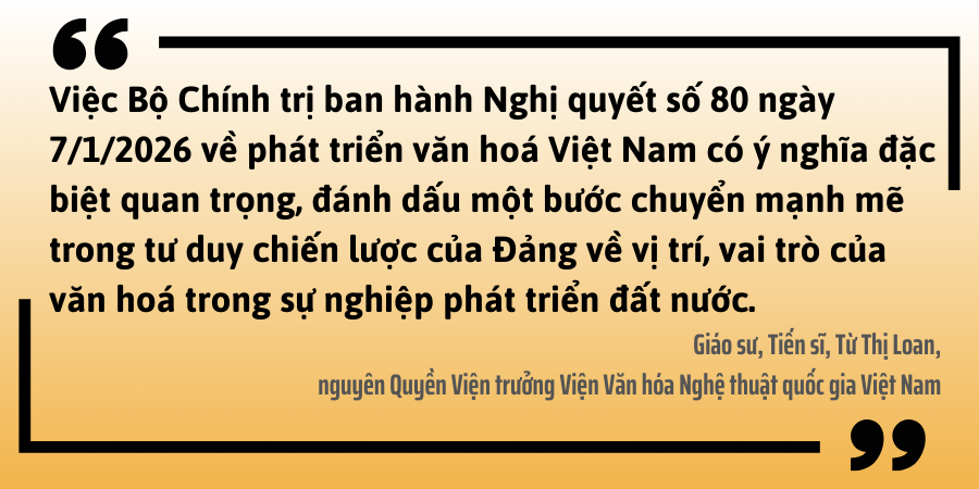 Theo Giáo sư, Tiến sĩ, Từ Thị Loan, nguyên Quyền Viện trưởng Viện Văn hóa Nghệ thuật quốc gia Việt Nam, “Việc Bộ Chính trị ban hành Nghị quyết số 80 ngày 7/1/2026 về phát triển văn hoá Việt Nam có ý nghĩa đặc biệt quan trọng, đánh dấu một bước chuyển mạnh mẽ trong tư duy chiến lược của Đảng về vị trí, vai trò của văn hoá trong sự nghiệp phát triển đất nước. Nghị quyết ra đời trong bối cảnh Việt Nam bước vào giai đoạn phát triển mới với yêu cầu vừa tăng trưởng nhanh, vừa phát triển bền vững, vừa khẳng định bản sắc và sức mạnh mềm quốc gia trong môi trường toàn cầu hoá và chuyển đổi số sâu rộng”.