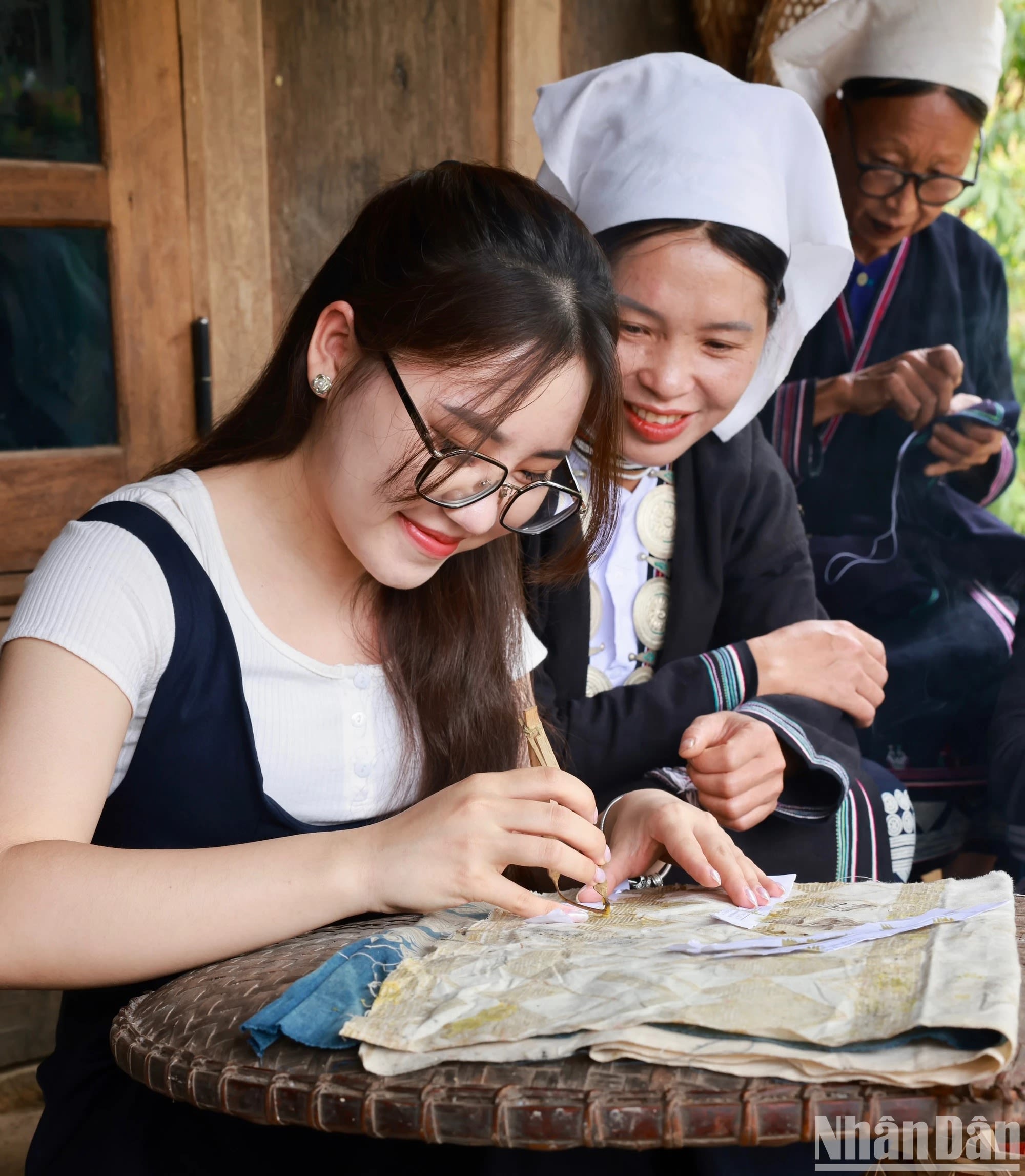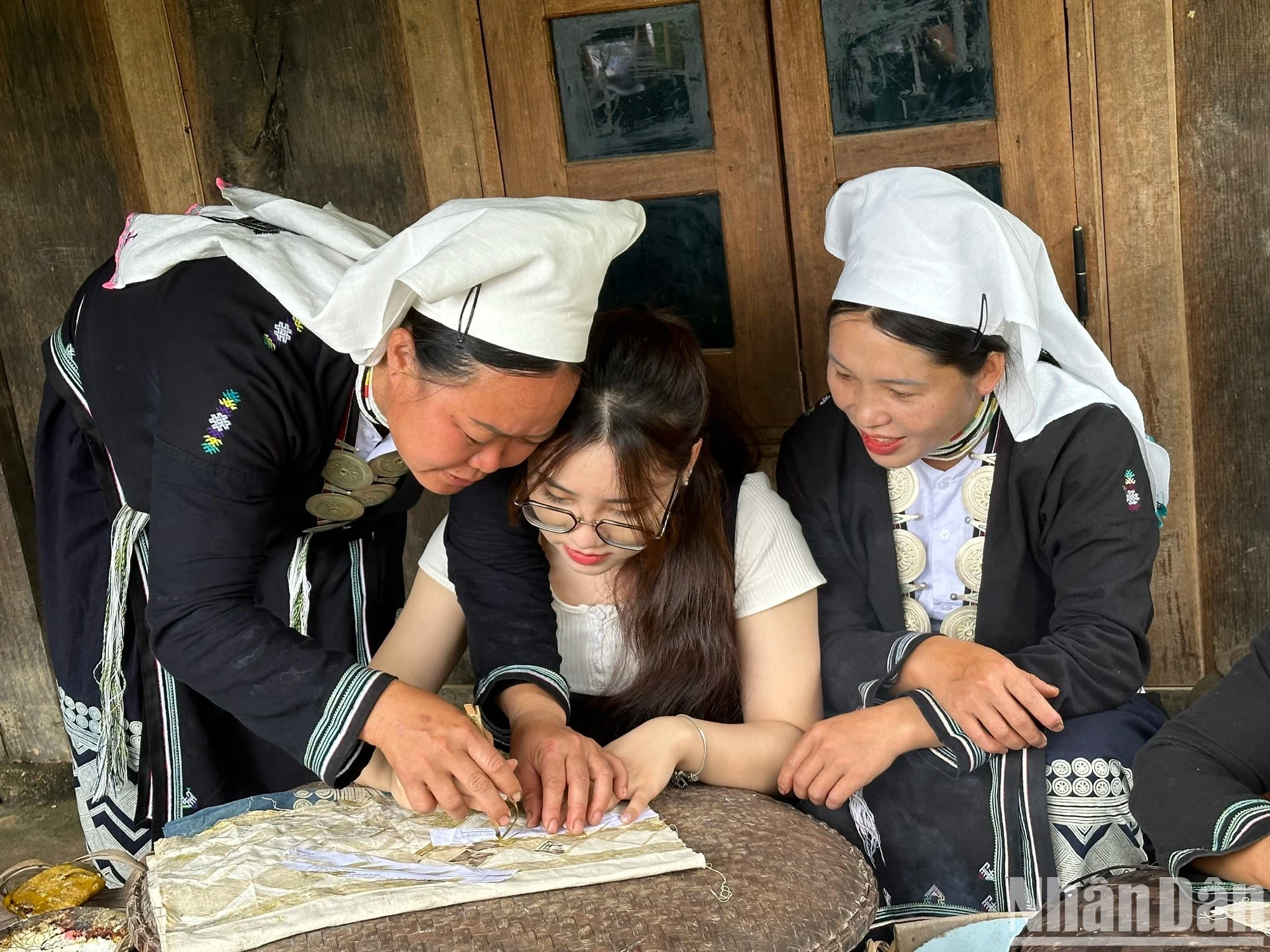 Hải Anh cũng đã có những trải nghiệm thật khó quên khi được các chị em trong Tổ thêu in hoa văn sáp ong trong làng hướng dẫn nhiệt tình để tạo ra một mảnh vải thực hiện kỹ thuật in sáp ong truyền thống của đồng bào Dao Tiền.