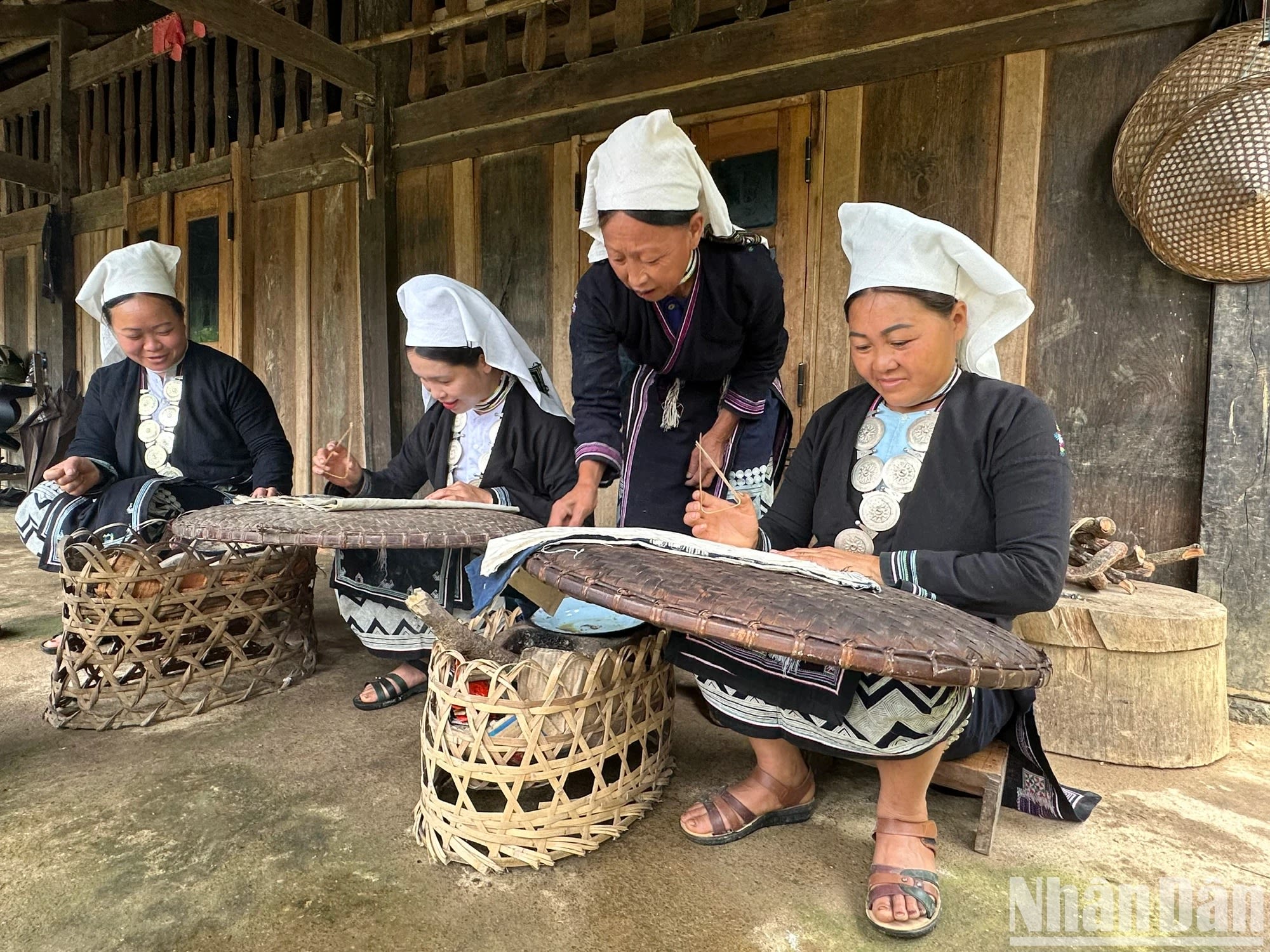 Chị em phụ nữ Dao Tiền ở Hoài Khao luôn đề cao ý thức giữ gìn nghề dệt và in sáp ong truyền thống của dân tộc. (Ảnh: THI PHONG)