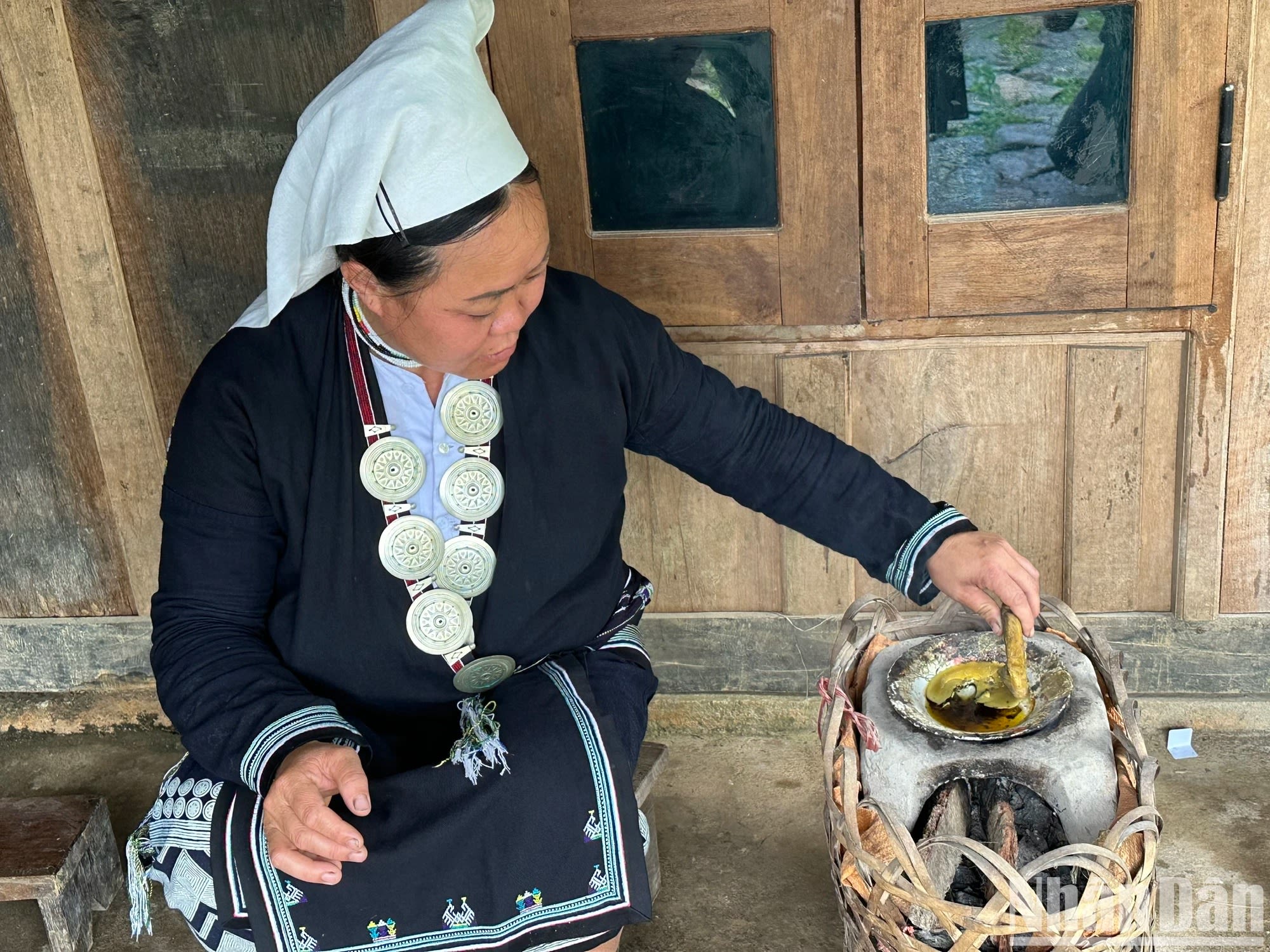 Chị Bàn Thị Liên đun nóng sáp ong trước khi in. (Ảnh: THI PHONG)