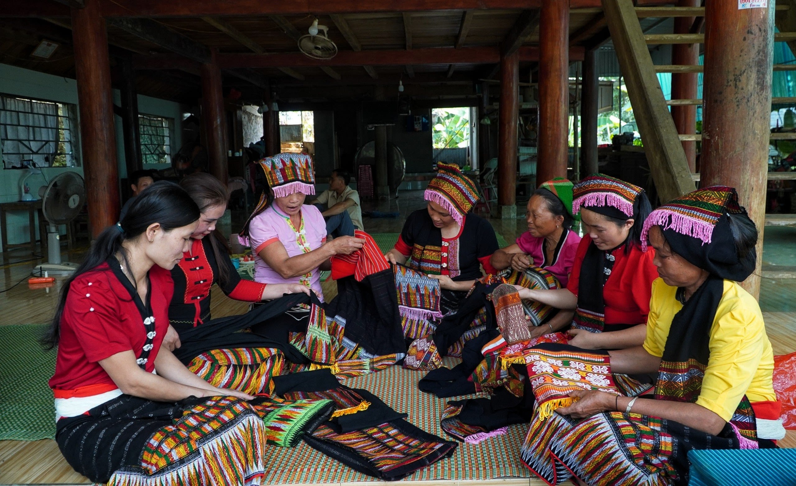 Các chị em tổ hợp tác dệt thổ cẩm xã Châu Thành trong một buổi sinh hoạt.