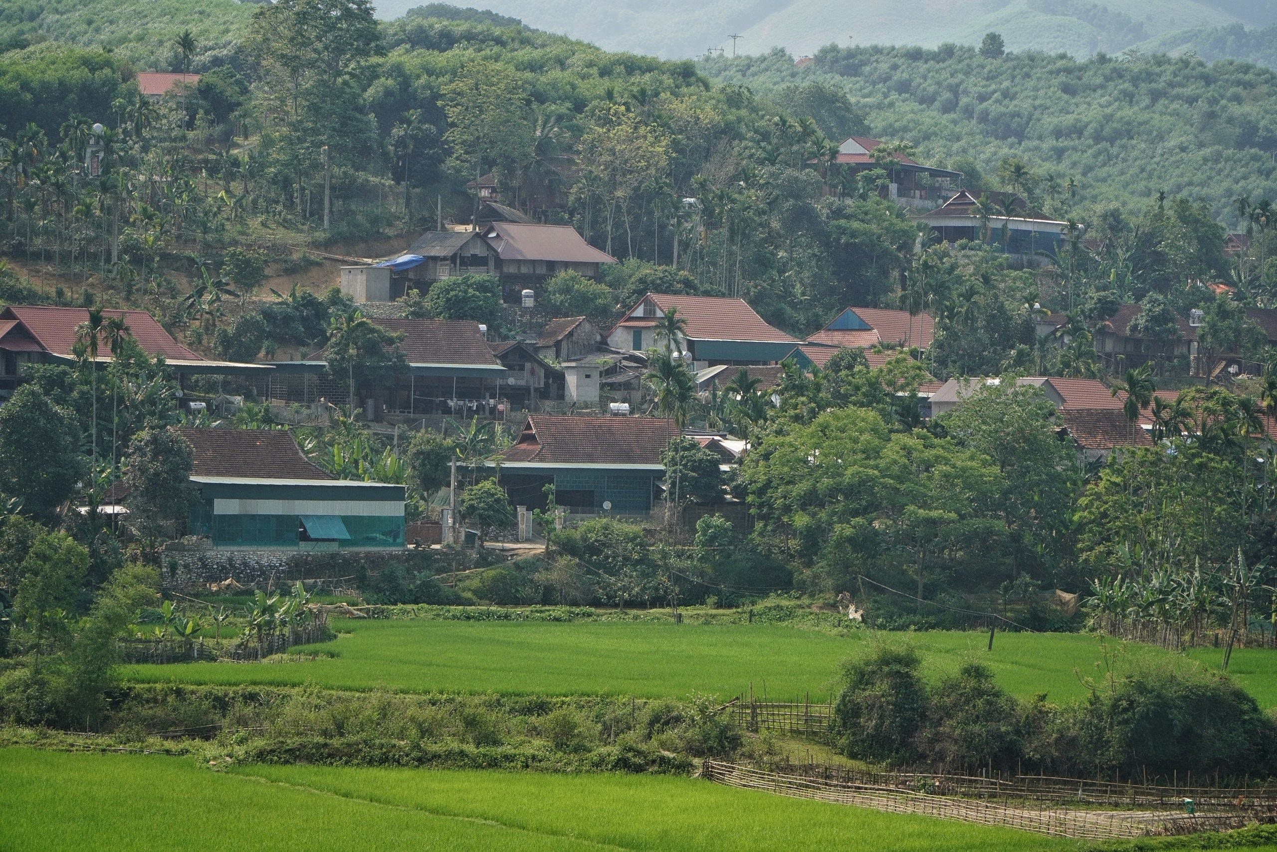 Dọc đường, những bản làng người Thái ở hai bên quốc lộ với những nếp nhà sàn truyền thống thân thuộc ẩn hiện sau những vườn cây xanh, hàng cau cao vút phía trước trông rất đỗi yên bình và thơ mộng. Thấp thoáng trong nếp nhà sàn là những thiếu nữ Thái với trang phục truyền thống đang ngồi bên khung cửi dệt vải.