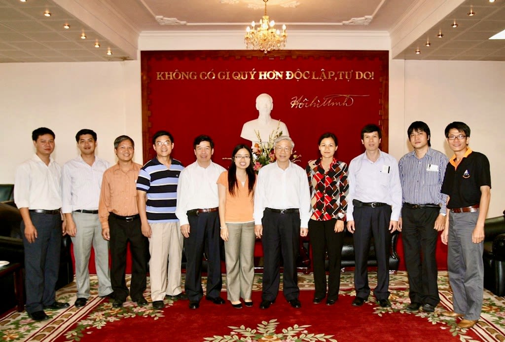 Đồng chí Nguyễn Phú Trọng với các phóng viên TTXVN: Lê Trí Dũng, Nguyễn Thị Sự và nhóm phóng viên chuyên trách trong một chuyến công tác.