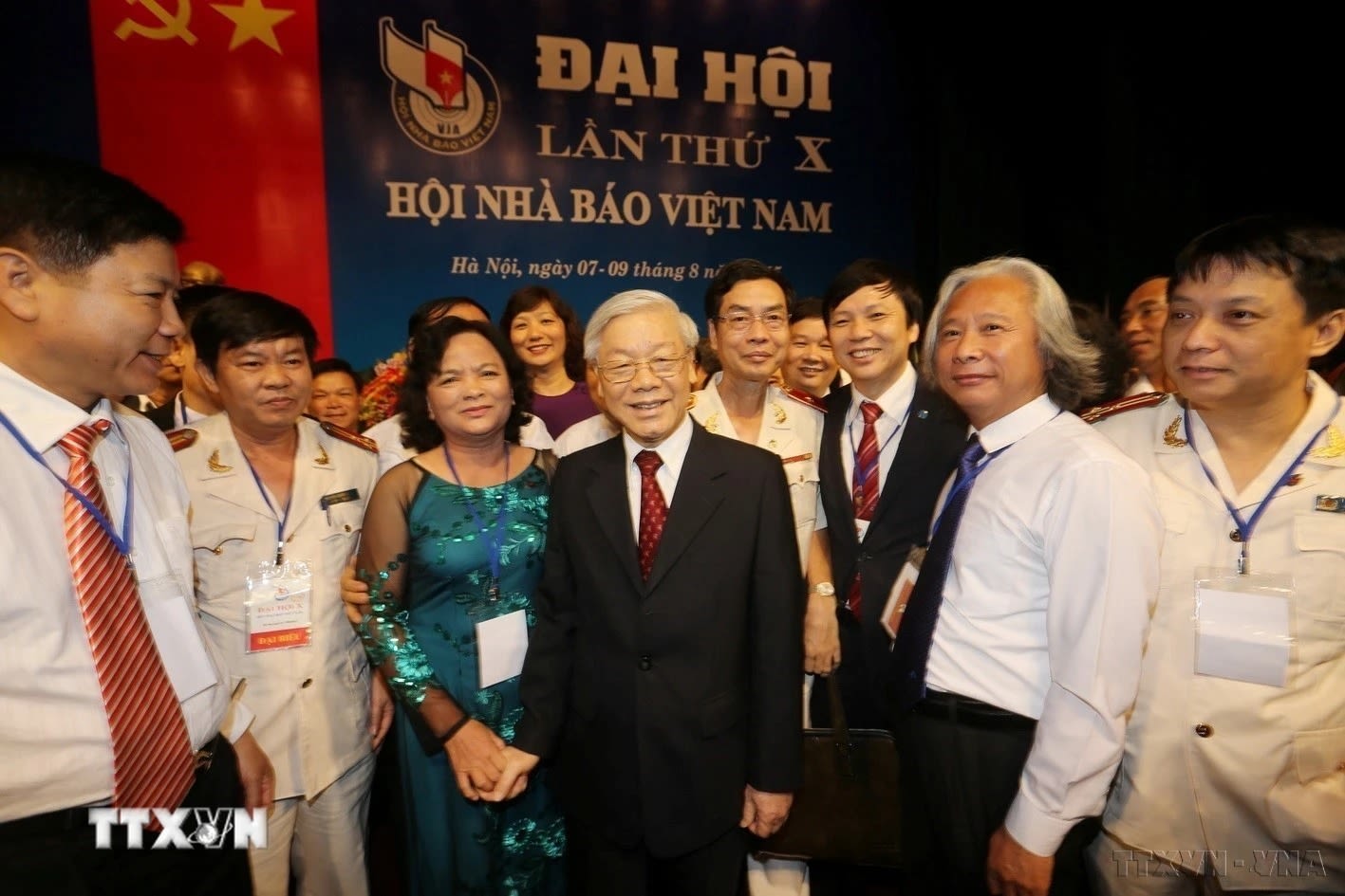 Tổng Bí thư Nguyễn Phú Trọng với các nhà báo dự Đại hội Hội nhà báo lần thứ X, tháng 8/2015.